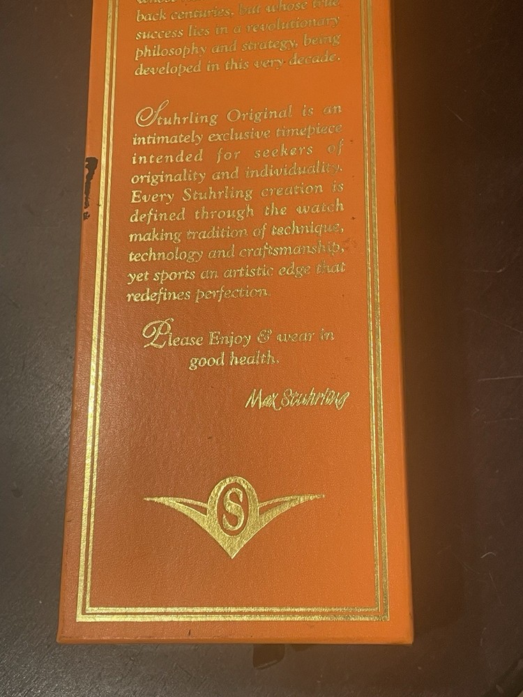 This is an empty STUHRLING watch box. There is a tear on the back side of the box (see photos). Otherwise in good used condition. 11.75” x 3.5” x 1.5”