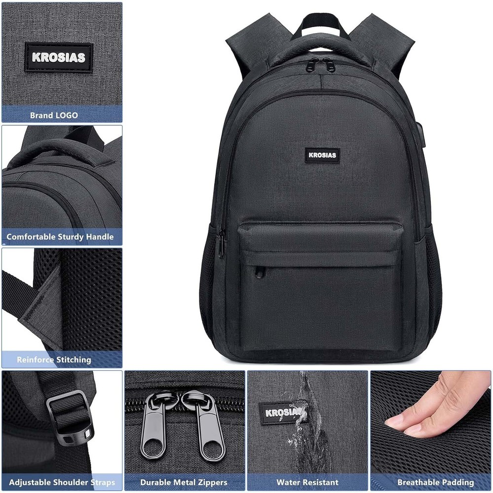 School Backpack for Teen Boys, Men and Women 15.6 inch, Black Product Details Large Capacity: This large laptop backpack is designed for both women and men, making it a perfect choice for anyone. With a spacious capacity of 20-30 liters, it provides ample storage options. It features a padded laptop sleeve and three separate compartments with lots of inside pockets, ensuring that you can keep your essentials such as 15.6 inch laptop, A4 folder, books, clothes, keys within reach and organized. Sturdy Material & Solid: Carefully crafted, this school backpack is made of water resistant and sturdy polyester fabric and features a sturdy and smooth zipper, ensuring that you can always rely on this laptop backpack for any load. Moreover, each backpack for teens is equipped with a sturdy web haul handle. Size: 17.7'' x 12.2'' x 6.9''. Comfortable to USE: This school backpack is designed for the convenience and comfort of teenage boys and girls. Each college backpack features an ergonomic back panel with multi layer sponge padding and S-curved shoulder straps with breathable mesh that can be easily adjusted to fit a student's body. Back luggage straps design allows your backpack fit on luggage or suitcase for easier transport. USB Port Design & Anti Theft: The USB laptop backpack offers the convenience of charging and connecting devices without the hassle of carrying additional chargers or cables. It allows for the charging of smartphones, tablets, or other electronic devices anytime and anywhere, enhancing convenience and flexibility (Power bank not included). ANTI THEFT back hidden zipper pocket will keep your valuable belongings. Fashion Backpack: A stylish appearance is the most popular choice among students for school backpacks. Moreover, they can also function as laptop back pack or school bookbags. Whether you are in college, high school, middle school, or even commuting to work, it is crucial to invest in a KROSIAS backpack that offers exceptional quality and functionality. (Age: over 3 years old)