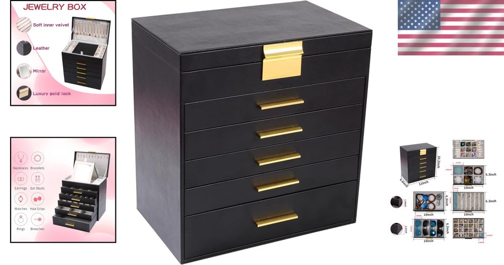 Stylish 6-Layer Jewelry Organizer with Mirror - Convenient and Lockable Design ‹ › ‹ › ‹ › ‹ › ‹ › ‹ › ‹ › ‹ › ‹ › Stylish 6-Layer Jewelry Organizer with Mirror Convenient and Lockable Design Organize Your Jewelry in Style Large jewelry box featuring 6 layers and multiple compartments. Ample storage space for earrings, rings, sunglasses, and necklaces. Say goodbye to tangled messes and misplaced items. Convenient Mirror and Lockable Design Includes built-in mirror for easy accessorizing on the go. Lockable design ensures the security of your valuables. Provides peace of mind whether at home or traveling. Elegant and Sturdy Construction First drawer with 24 earring slots for organized storage. Second drawer designed with 6 grids for bracelets, bangles and cuffs. Third drawer with four long grids, ideal for sunglasses, lipsticks, and watches. Bottom drawer offers substantial space for larger items, including cosmetics. Versatile and Practical Gift Option Perfect gift for loved ones celebrating birthdays, anniversaries, or special occasions. Combination of functionality and aesthetics appreciated by all jewelry enthusiasts. Satisfaction Guaranteed At our brand, customer satisfaction is a priority. The jewelry box meets the high expectations of jewelry enthusiasts with various sized grids and compartments, serving as a versatile storage solution. Give your jewelry a stylish home while keeping it organized and secure. Order your Stylish 6-Layer Jewelry Organizer today and transform your accessorizing experience! Shipping Free & Fast Shipping - We offer free shipping to most of the USA with a normal delivery time of 3-7 days. However, due to the current situation, additional delivery time (up to 3 weeks) may be required for some items. Alternative Carriers - We may use alternative carriers (e.g. USPS, FedEx, UPS, etc.) to ensure your package arrives safely and on time. Due to the use of multiple carriers, we are unable to provide a tracking number automatically. Handling Time - Orders are processed and shipped within 1-2 business days of receiving cleared payment. Shipping Restrictions - Shipping to Alaska, Hawaii, Puerto Rico, Guam, and other US territories may incur shipping charges or delivery restrictions. Please contact us before ordering, or your order can be refunded/cancelled. State Restrictions - There may be restrictions based on your state of purchase. For example, certain items may not be shipped to California due to state regulations. Contact for Tracking Updates - If you require tracking updates or have any concerns about the delivery of your order, please feel free to contact us, and we will be happy to assist you. Return Please see our eBay Return Policy. Thank you. Payment We accept all major credit cards, PayPal, and Apple Pay for your convenience. Your payment information is secure and encrypted to ensure a safe and seamless transaction. Please complete your payment within 3 days of purchase to avoid any delays in shipping. Feedback Your feedback is extremely important to us. We strive to provide the best products and customer service possible. If you are satisfied with your purchase, please take a moment to leave us a positive review. If you have any concerns or issues with your order, please contact us before leaving negative feedback. We are committed to resolving any problems and ensuring your satisfaction. Contact Us If you have any questions or concerns, please feel free to reach out to our customer support team. You can contact us through the eBay messaging system. We are available Monday to Friday, 9:00 am to 5:00 pm EST, and we will do our best to respond to your inquiry within 24 hours. Thank you for supporting our small family business! UPC: Not Set Unit Quantity: 1 Items Included: Jewelry Box Suitable For: Bracelet,Earring,Necklace,Bangle,Watch Theme: Jewelry Box Organizer Material: Faux Leather,Engineered Wood Features: Mirror,Lockable,Jewelry Organizer,Adjustable Brand: Unbranded Type: Jewelry Box Color: Black Lining Material: None Department: Women Shape: Rectangle Country/Region of Manufacture: Not Set Capacity: More Than 25 Pieces Item Depth: 10 in Item Length: Not Set Item Width: Not Set MPN: Not Set Unit Type: lb Vintage: Not Set Personalize: Not Set Handmade: Not Set Customized: Not Set