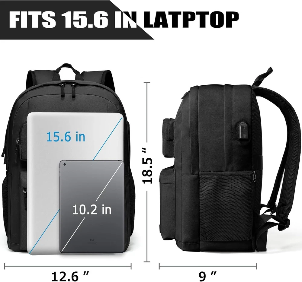 Backpack for School Teen Boys and Girls, 15.6 Inch, Black Product Details Product Dimensions: 8 x 12 x 18 inches Item Weight: 1.48 pounds Department: unisex-adult Age Range Description: 3 years old and above Number Of Items: 1 Capacity Total: 28 Liters 【Comfort and Sturdy】The backpack OUTSIZE is 18.5*12.6*9 inches, 33L. BIKROD laptop backpack is made of high quality water-resistant, sturdy fabric provides a sturdy and chic exterior. Comfortable airflow back design with foam, gives you maximum back support. Breathable and adjustable shoulder straps relieve the stress of shoulder.Ensure a secure & long-lasting usage everyday & weekend. 【Classic Design】Main compartment with 15.6” laptop pocket and an extra padded sleeve for tablets or Kindle, can storage books and business files while still having room for daily necessities, front compartment with organizer and 2 front pockets provide plenty of capacity for the organization. 2 elastic side pockets can fit different size of bottles. 【Multi Function】BIKROD Laptop backpacks with a built-in USB charging port, easy to charge your phone when on-the-go (Not includes the power bank). With a luggage belt on the back panel, it is easy to put on the luggage handle when travel. One hidden anti-theft pocket to protect your important items. 【Great Gift】This water resistant laptop backpack will be a perfect backpack for College. Also as a casual travel backpack for travel, work backpack for business. A good gift choice for men and women, present for christmas. ★Age: suitable over 3 years old.Serve you well as professional office work backpack, slim USB charging backpack, perfects for business traveling, weekend getaways, shopping & outdoor activities in daily life, making your journey and travelling more convenient wherever you go. Specifications: Style: Classic Capacity: 28 L Dimensions: 18.5" x 12" x 9" / 46 x 32 x 23 cm Laptop Dimensions: 16"and below Features: Ergonomic S-curve shoulder straps Front utility pocket with organizer Fully padded back panel Pleated front stash pocket Side water bottle pocket Two large main compartments Web haul handle Dedicated 15.6" padded laptop compartment Zippered front stash pocket All of our bags come with a lifetime promise. Because good stuff should last. If one of our bags breaks, we’ll replace it or fix it. No questions asked.