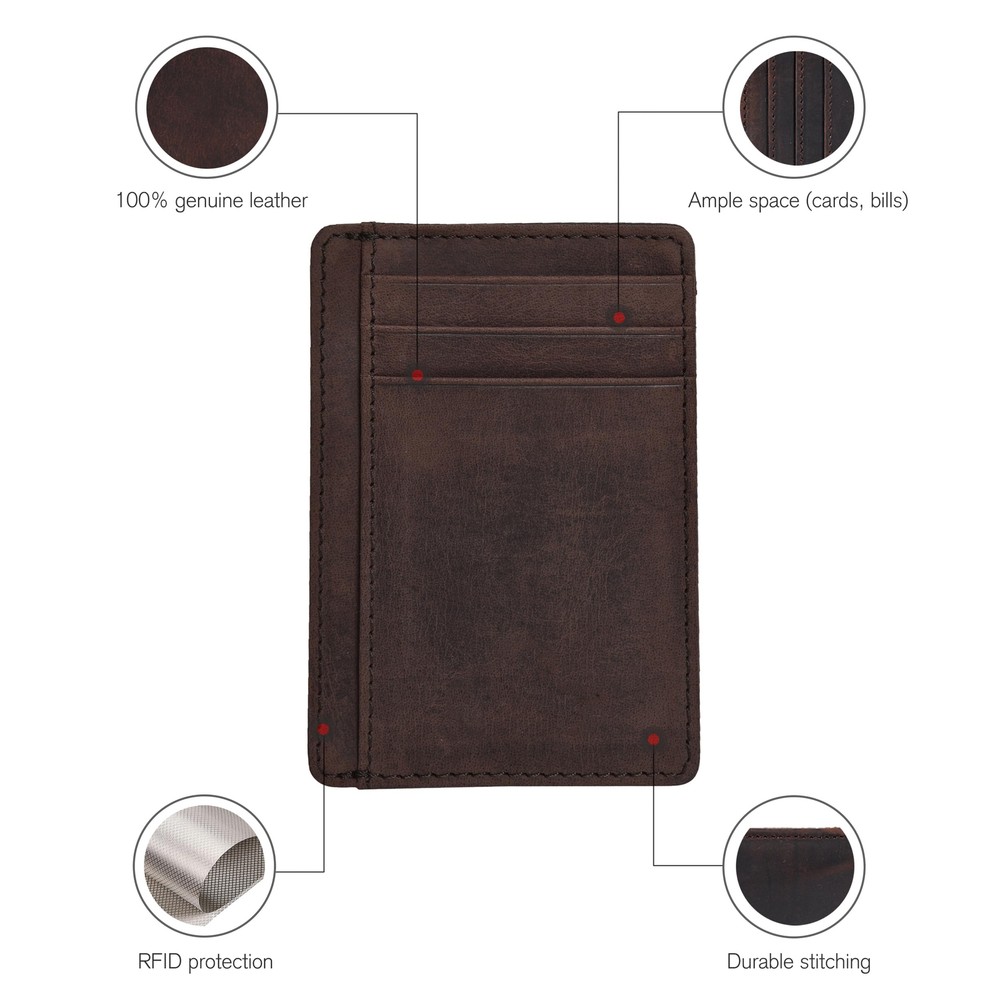 Our minimalist wallet has a slim and compact design but has plenty of room. It just measures 4.4 x 3.2 inches and can still hold 5 Credit Cards, 1 ID Card, 1 Document and Currency Compartment for you. To provide the best experience we use Superior 100% Genuine Cowhide Leather masterfully sewed with durable and polyester fabric ensuring long lasting durability. Rest assured as our leather wallets are equipped with advance RFID Blocking technology which protects your valuable information stored on RFID chips from unauthorised scans while you are on the go (specifically 13.56 MHz RFID / NFC standard). All our RFID slim Wallets are tested and approved to keep you and your data safe. Your satisfaction is our top priority. We're confident you'll adore our slim wallet, but if dissatisfied, reach out to us. These are perfect gift wallets for men and Women. Our minimalist wallets are high on utility, durability and have the quality materials. It’s a perfect gifting item to your friends, family, near and dear ones. It fits as a perfect gift under all festivals and occasions like Father’s Day, Mother’s Day, Valentine’s Day, Christmas,New Year etc and it comes in an attractive packing.