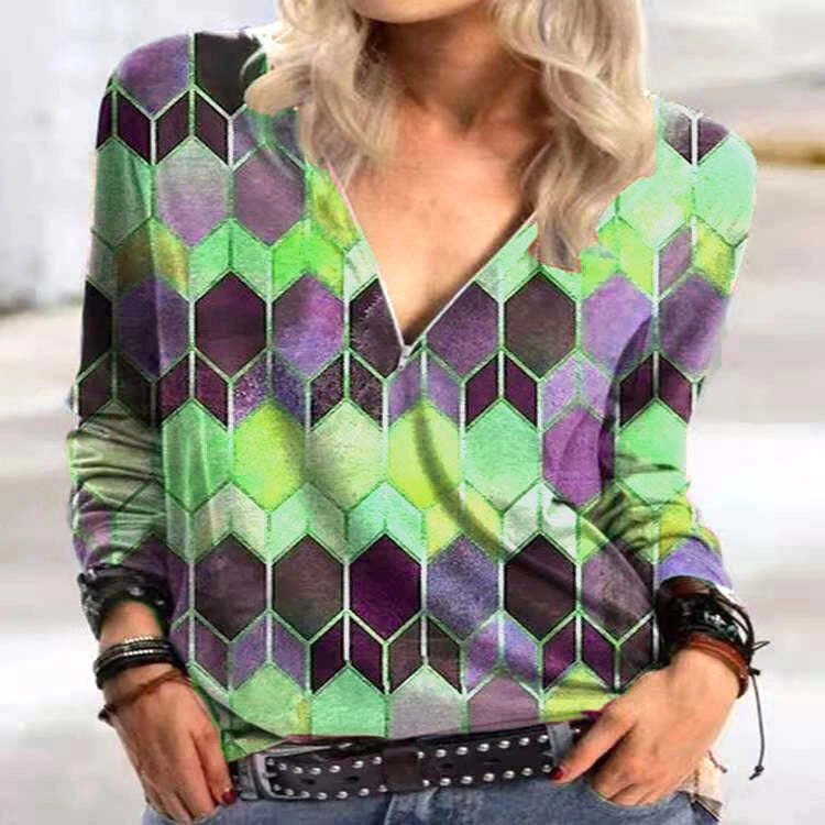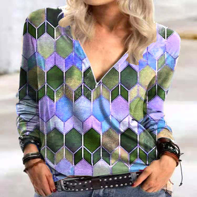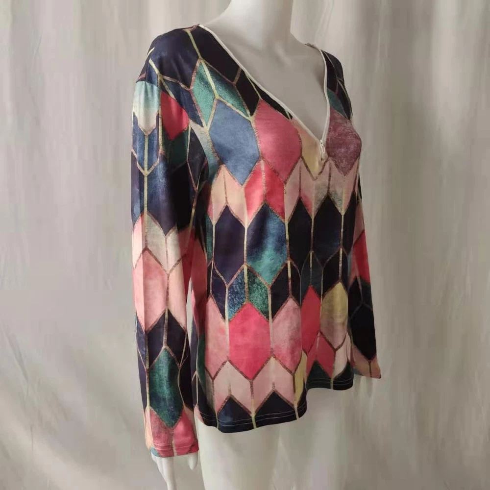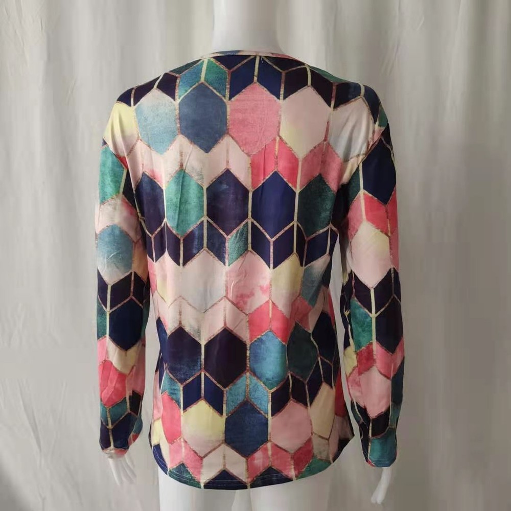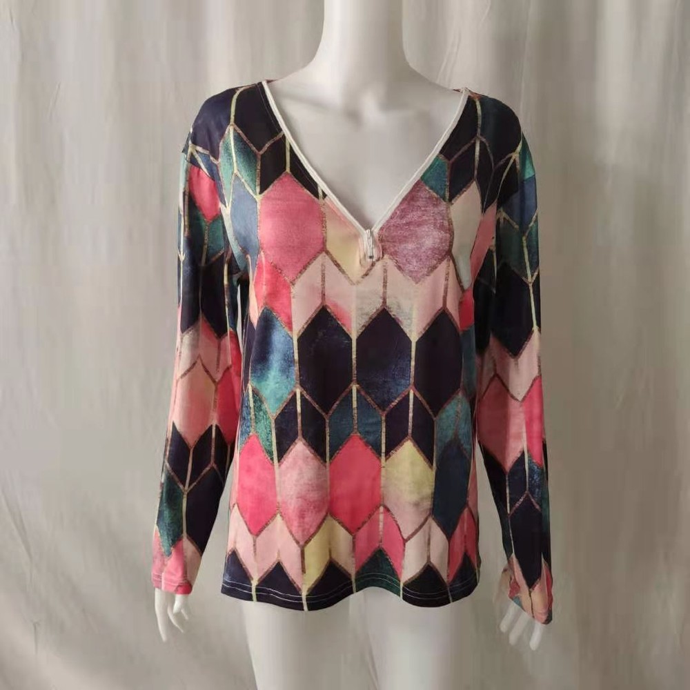 Product information: Supply category: Spot Fabric name: Cotton blended Main fabric composition: cotton The content of the main fabric ingredient: 51%-70% Main fabric composition 2: polyester fiber (polyester) The content of main fabric ingredient 2: 10%-29% Lining composition: polyester fiber (polyester) Lining ingredient content: 10% or less Pattern: Geometry Style: Street Style: Hedging Sleeve length: long sleeve Process: Printing/Dyeing Edition type: Slim type Length of dress: ordinary style (50cm<length of dress≤65cm) Collar type: V-neck Sleeve type: conventional sleeve Popular elements: printing Color: Geometry-Green, Geometry-Yellow, Geometry-Sky Blue, Geometry-Blue, Geometry-Purple Suitable age: 25-29 years old Style type: street hipster Size Information: Size: S, M, L, XL, 2XL, 3XL, 4XL, 5XL Size/cm Bust Sleeve Length S 90 57 67 M 94 58 68 L 98 59 69 XL 102 60 70 2XL 106 61 71 3XL 110 62 72 4XL 114 63 73 5XL 118 64 74 Note: 1. Asian sizes are 1 to 2 sizes smaller than European and American people. Choose the larger size if your size between two sizes. Please allow 2-3cm differences due to manual measurement. 2. Please check the size chart carefully before you buy the item, if you don't know how to choose size, please contact our customer service. you know, the different computers display colors differently, the color of the actual item may vary slightly from the following images. Packing list: Women's T-shirt*1 Product Image:
