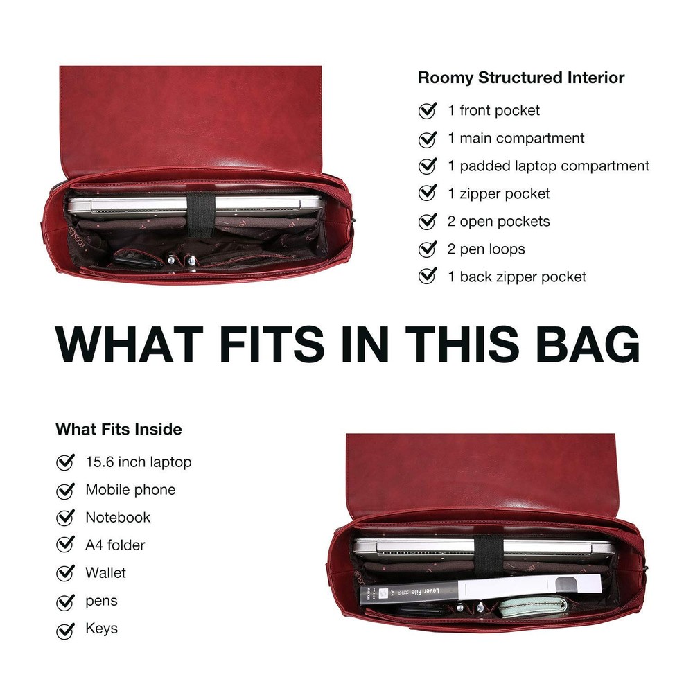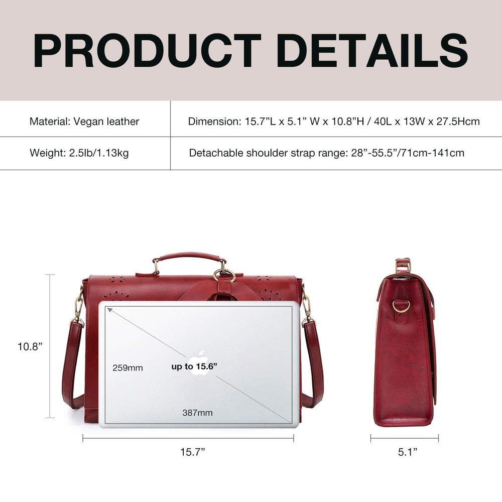 Original Design - has created this elegant vintage briefcase for women since the year 2015, we provide typique styles and superior quality with updated durable hardwares for your daily use as a business bag, briefcase, or teacher bag. It’s also a perfect gift choice Eco Friendly - Made of durable and high quality vegan leather (PU leather), which don’t hurt animals Capacity - 15.7 x 10.8 x 5 inches; perfect to hold a laptop up to 15.6 inch, files, paper size documents, notebooks, etc Well Constructed - Designed with top handle and an adjustable and removable shoulder strap with 55" drop when fully extended. 1 core conpartment, 2 small slip pockets, 1 small zipper pocket, 1 padded compartment with a hook and loop fastener for laptops up to 15.6 inches;1 front open pocket + 1 back zipper pocket for quick access. Warranty - provides outstanding products and a wonderful buying experience. If you are not satisfied with our product or service for any reason, please reach out and we will attempt to resolve any issues and ensure your contentment.