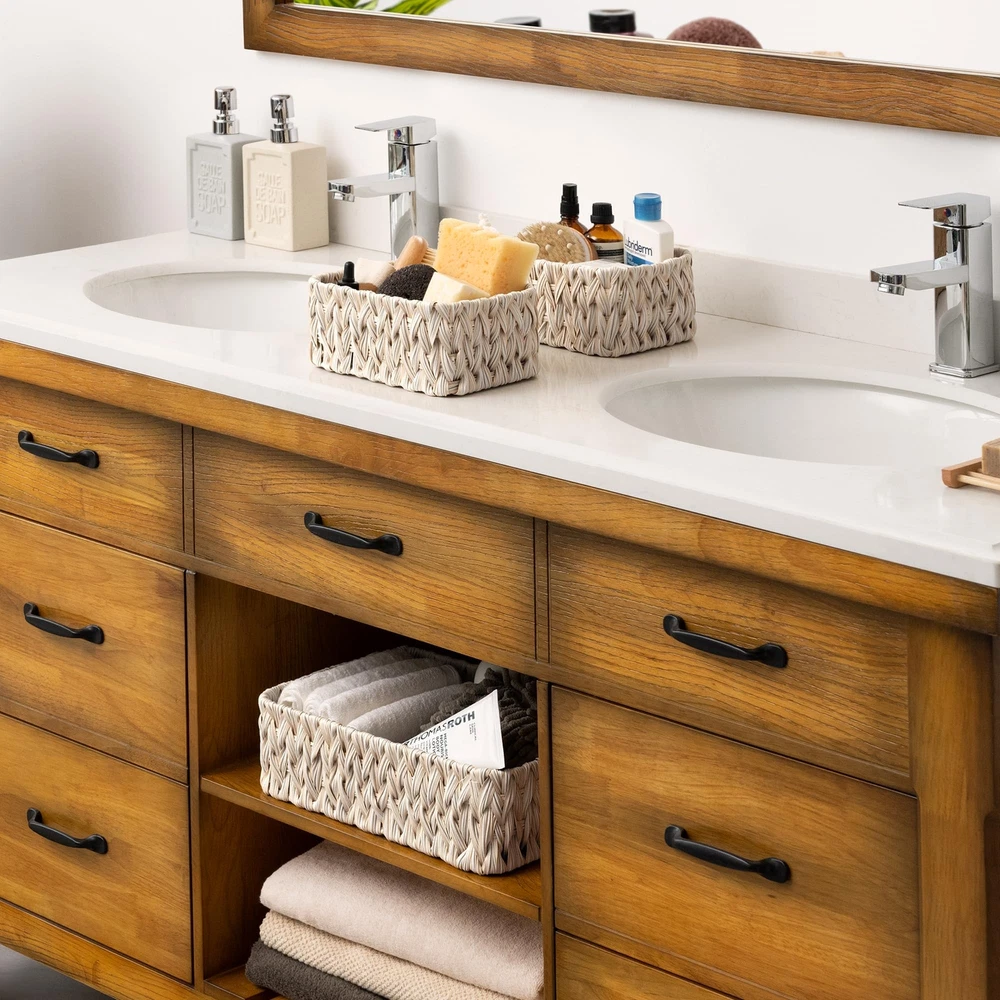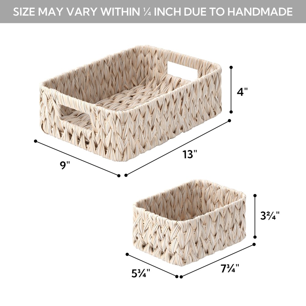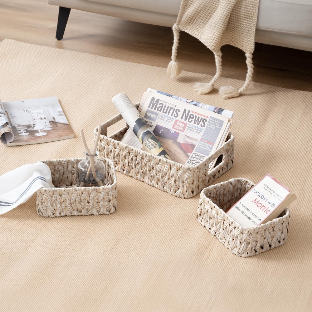 Sturdy Structure:Handwoven with high-quality PP materials on a durable metal frame, this basket combines craftsmanship with durability, making it perfect for your long-term storage needs. Set of 3: These baskets come in a set of 3, with sizes of 13 x 9 x 4 inches and 7¾ x 5¾ x 3½ inches respectively. The varying sizes make them suitable for different home spaces, catering to your diverse storage needs. Basket for Decor: Available in multiple colors, this decorative basket complements various decor styles, making it a perfect addition to any room in your home. Convenient Handles:With convenient side handles for easy portability, this woven basket is the ideal solution for keeping your home neat and tidy. Versatile Storage:With durable construction and dual-sized design, this wicker baskets offers multi-functional storage, perfect for organizing towels, clothes, documents and more in the bathroom, pantry, laundry, living room, bedroom, or office.