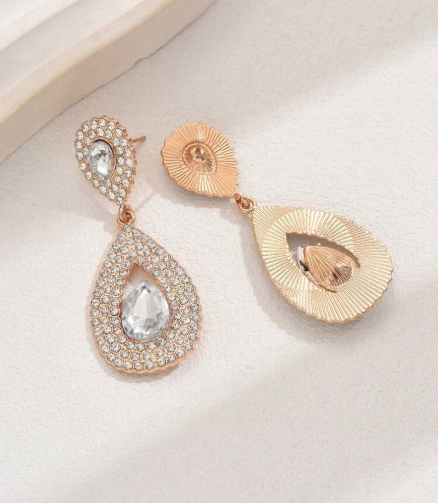 This stylish pair of earrings is designed for women, featuring a trendy water drop pendant style in a dazzling gold color. The earrings are made with rhinestone material, adding a touch of elegance and sophistication to any outfit. Perfect for adding a touch of glamour to both daily wear, gifts, party, wedding, these dangle/drop earrings are a versatile and chic accessory for any fashion-forward individual.