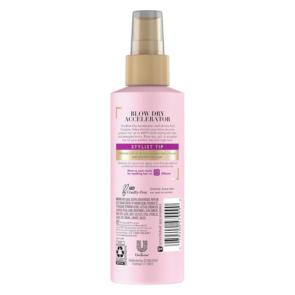 Suave Pink Blow Dry Accelerator Hair Heat Protector Heat Protecting Spray Heat Protectant Spray and Detangler 6 oz (Pack of 2) Product Benefits Heat Protection, Damage Control Scent Unscented Liquid Volume 12 Fluid Ounces Item Form Spray Brand Suave About this item The information below is per-pack only Suave Professionals Blow Dry Accelerator Heat Protectant Spray, with Amino Acid Complex, softens, detangles and shields for gorgeous and workable hair that’s protected up to 450 ° This heat protecting spray for all hair types helps to detangle, protect and shorten your drying time This hair heat protector is a part of our 3-step haircare regimen for workable hair with products to cleanse, condition and shape your hair into the perfect look This hair heat protectant spray, formulated with Amino Acid Complex, improves hair’s suppleness and manageability This heat protecting spray was created to help keep hair strong, more manageable and ready to style any look Product Description Practice safe styling. Suave Professionals Blow Dry Accelerator Heat Protecting Spray with Amino Acid Complex softens and shields for gorgeous, workable hair that’s protected up to 450 °. This heat protecting spray for all hair types smooths the hair fiber and preps hair for your perfect look. Looking for workable, ready for anything hair? Say hello to our professional inspired 3-step haircare regimen. This collection includes products to cleanse, condition and shape your hair into the perfect look, plus use our additional stylers depending on how you style your hair. This heat protectant spray was created to keep hair strong, more manageable and ready to style any look. Our hair heat protector, formulated with Amino Acid Complex, improves hair’s suppleness and manageability. This formula, with a unique complex helps smooth the hair cuticle to polish and remove any frizz. The result is hair that’s more supple, easier to style and that holds your style (aka the hair of your dreams). It’s time to transform your hair into manageable, ready-to-style locks. Use this heat protecting spray together with our style ready shampoos and conditioners for gorgeous and workable hair that’s ready for anything.