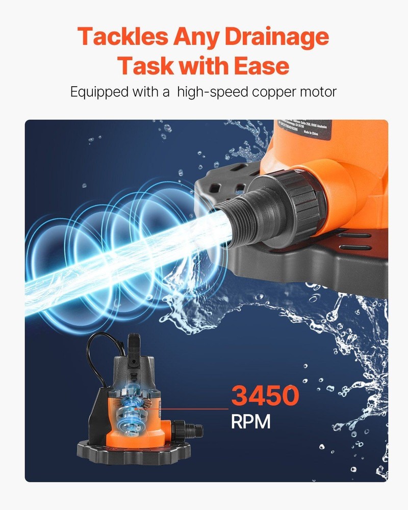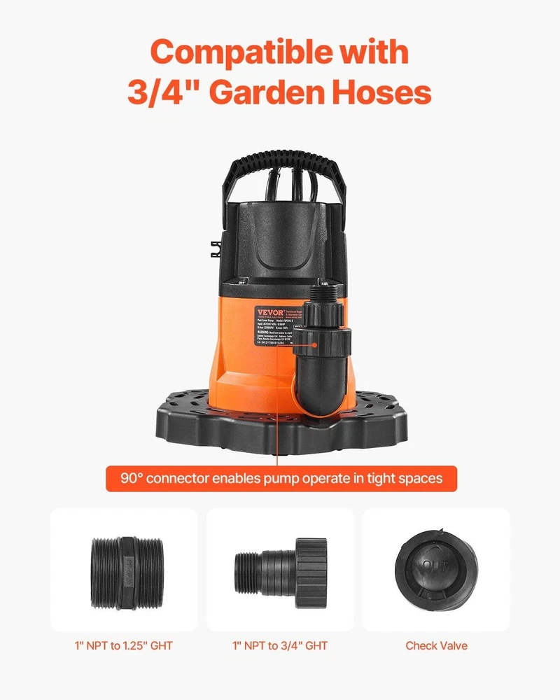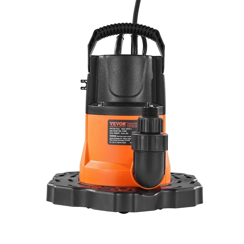 Features: Automatic Operation: Equipped with an automatic switch, this pool cover pump turns on and off based on the water level, no manual operation is needed. It activates when the water level rises above 2.09 in and stops when it drops below 0.35 in. Simply tilt the pump and submerge it in water for a few seconds to expel air before use (Avoid lifting the pump by the power cord to avoid permanent damage) Efficient Water Drainage: Powered by a high-speed 3,450 RPM copper motor, this automatic pool cover pump delivers 0.66 HP of robust power, draining up to 3,200 GPH. Max. Head: 26 ft / 7.93 m. Say goodbye to manual water drainage and let this pump quickly clear your pool cover, keeping it dry of water Security Comes First: Featuring a built-in overheat protection, this submersible pool cover pump automatically shuts off when the motor reaches the preset temperature of 302°F. This security feature minimizes the risk of damage and extends your pump's service life Waterproof & Clog-Resistant: With an outstanding IPX8 waterproof rating, this swimming pool cover pump operates reliably even when fully submerged in water. The filter base efficiently traps leaves, dirt, and debris, minimizing the risk of clogs and keeping the pump from tipping over Everything You Need: This pool cover pump comes with a NPT 1" thread & 1.25" barb adapter and a 1-inch NPT to 3/4-inch GHT elbow adapter. The built-in check valve avoids backflow. Additionally, a 33-foot nylon rope is included for easy handling and secure pump placement. 0.66 HP Automatic Pool Cover Pump, Hands-Free Water Drainage Our pool cover pump features a copper motor with 3,450 RPM high speed, providing fast water drainage. It has a 3,200 GPH flow rate, 26 ft head lift, IPX8 waterproof rating, overheat protection, and 25 ft power cord, giving you peace of mind. No need for constant monitoring or manual adjustments. The built-in filter at the bottom of the pool cover pump effectively reduces debris and impurities, protecting the pump from damage. It enhances performance and extends service life, reducing maintenance costs while ensuring long-lasting operation. With the included durable nylon rope, you can easily secure the submersible pool cover pump in place along the poolside or any suitable location, keeping it from shifting due to water flow or wind. It provides enhanced stability and security during operation. Equipped with a 25-foot power cord, this swimming pool cover pump plugs into any standard 115V outlet. The long cord reduces the need for extension cables, minimizing the potential risks associated with electrical connections. Thanks to its portability and high efficiency, this pool cover pump is ideal for a variety of scenarios. Whether it's for your pool, pool cover, hot tub, or inflatable water park, this pump makes water drainage quick and hassle-free in any setting.