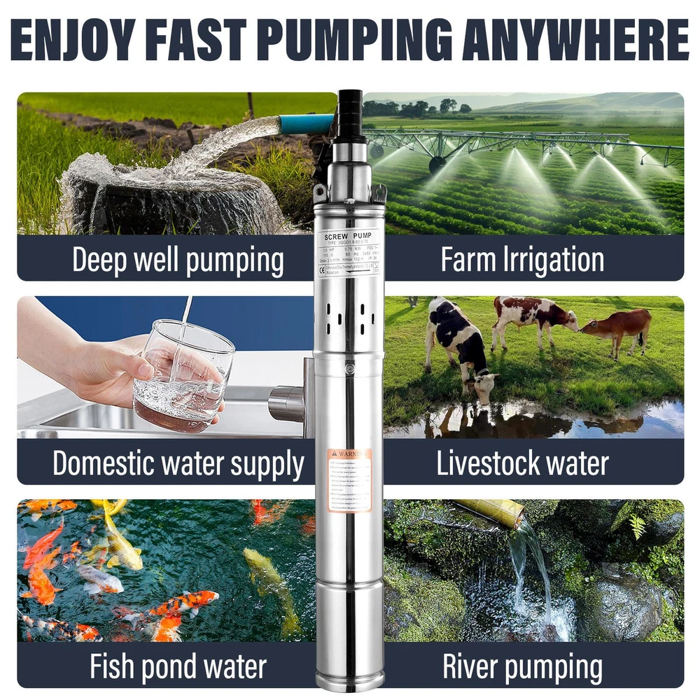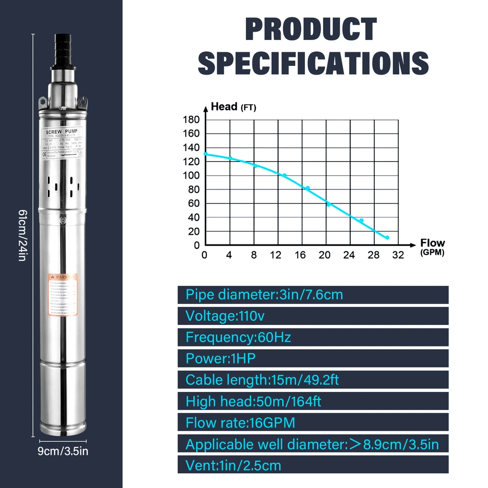 Submersible Pump 3" Deep Well Stainless Steel Water Pump 1HP 110V 16GPM 164ft Bullet Points: Enhanced Durability: Increase efficiency and maintain animal health with this deep well submersible pump, perfect for Livestock Drinking and applicable to a range of scenes like urban drainage and farmland irrigation Extensive Reach: With its unparalleled deep extraction ability, this submersible pump is specifically engineered for wells with a diameter of over 3.5 inches, and is capable of reaching depths up to 50 meters to ensure maximum water entry Stainless Steel Reliability: Built with stable high-quality stainless steel material, this deep well submersible pump features an incredible compression resistant and a sturdy frame that ensures long-lasting performance Long-Term Stability: With a sturdy copper motor and robust rotor built for high efficiency, our submersible pump boasts a precise and sturdy rotor design paired with a stable oil seal to ensure stable functioning in high-pressure water environments Efficient Functioning: Equipped with a high-quality built-in check valve, our deep well submersible pump ensures seamless operating; the stainless steel filter effectively removes impurities for uninterrupted water supply Our well water pump is a wonderful choice for urban drainage and wells with a diameter larger than 3.5 inches. Featuring a high-quality stainless steel frame, high-efficiency motor and rotor, and a stainless steel filter that effectively filters impurities. Specification: 1HP deep well pump: Tube diameter: about 3in/7.6cm Voltage: 110V Frequency: 60Hz Cable length: about 15m/49.2ft Lift: about 50m/164.04 ft Flows: 16GPM Applicable well diameter: more than 8.9cm/3.5inches Ventilation outlet: 1in/2.5cm Material: stainless steel Notes: 1. Please confirm whether the voltage and frequency work with your local standard before ordering. 2. It is forbidden to use it without water. 3. Due to different lighting and screen settings, the item color may be slightly different from the picture. 4. Due to different manual measurements, please allow a 1-2cm difference in size. Packing List: Deep well submersible pump*1 Power cable*1 Adapter*1 Manual*1 Payment should be completed within 2 days after auction closed, or unpaid dispute will be filed for an closing auction. An unpaid case will be filled after 4 days ● We strive for 100% customer satisfaction ! ● Positive Feedback is very important to us. ● We hope that you contact us immediately BEFORE you give us neutral or negative feedback, so that we can satisfactorily address your concerns. ● We promise to offer the lowest price and high quality produce. Our working time: Monday to Friday (9:00 am to 18:00pm)(Beijing Time) Saturday (9:00 am to 12:00am),except International Holiday. Dear buyers : ● Welcome to my store ! ● Your satisfaction is our top goal,we appreciate your patronizing. ● If you have any questions, please contact us before leave negative or neutral feedback, we will try our best to solve the issue to your satisfaction, thanks ! ● If you are satisfied with our service, please rate the details of the transaction (Detailed Seller Ratings) on eBay. ● Please always talk to us via ebay Message . ● We appreciate your business and look forward to growing our e-Bay sales with satisfied customers.