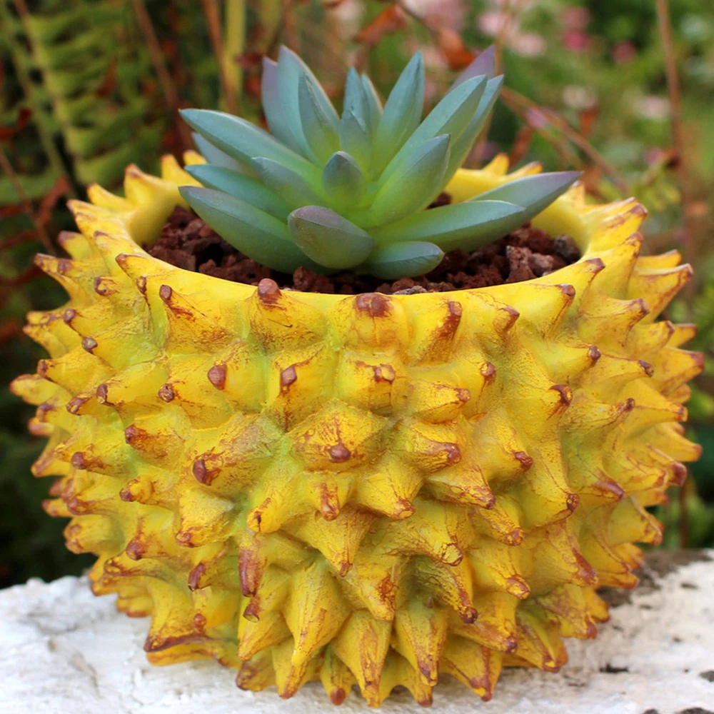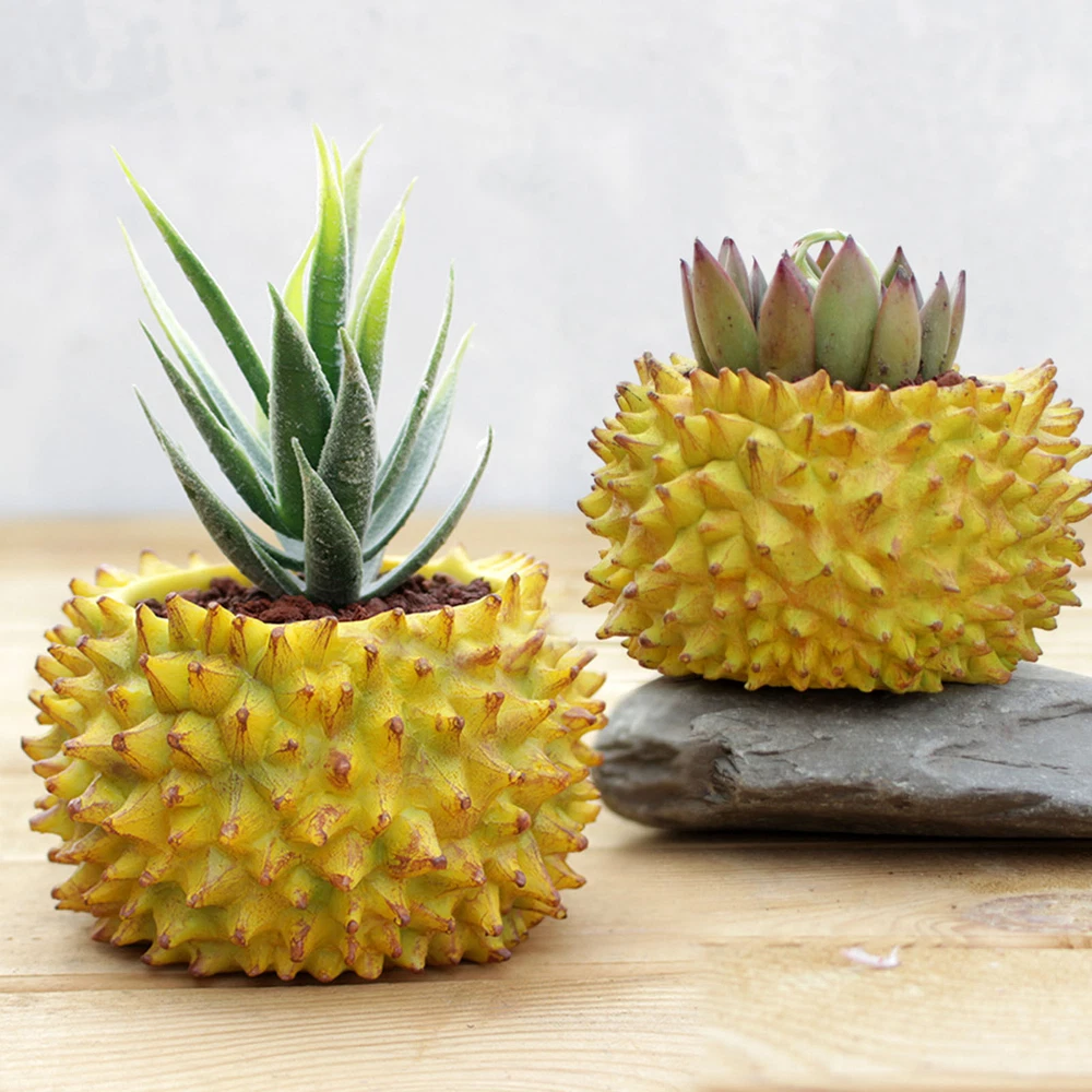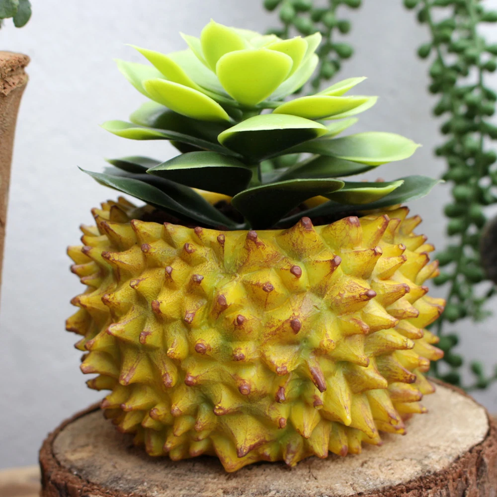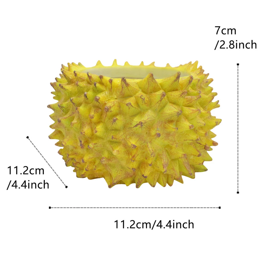Feature: 1. Durian Shape Design: Desktop flowerpot features an exquisite durian design that stands out beautifully. Its unique, attractive aesthetic adds a touch of greenery to both indoor and outdoor spaces that would brighten up any corner. 2. Resin Construction: Expertly crafted with a well manufactured resin texture, the flower pot ensures durability and lightness. This feature makes it both easy to move around and effortless to clean, adding to its functional value. 3. Versatile Usage: Small succulent pot serves multiple purposes, it can be used as a home decoration, office decor or could add charm to your balcony as a mini landscape. Whether you're sprucing up your living room or uplifting your office decor, this flowerpot makes a stylish choice. 4. Ideal for Succulents: Create a vibrant garden ambiance by growing succulents in this flowerpot. Its design promotes optimal growing conditions, helping you cultivate healthy and beautiful plants effortlessly. 5. Perfect Gift: With its unique durian design, this succulent flowerpot makes a charming gift to friends and family, especially those with a green thumb. It's a simple yet thoughtful offering that combines functionality and style. Specification: Item Type: Durian Flower Pot Material: Resin Size: Approx. 11.2x11.2cm / 4.41x4.41in Weight: Approx. 256.00g / 9.03oz Package List: 1 x Durian Flower Pot