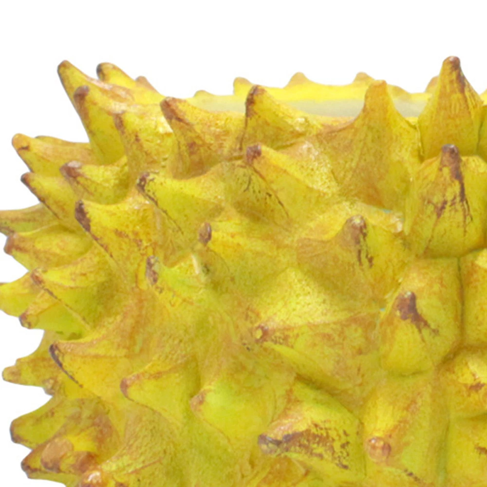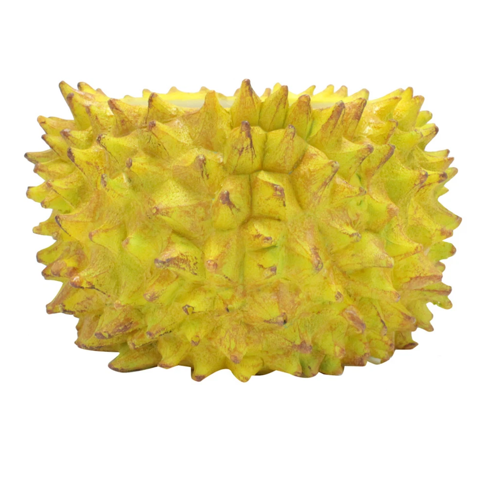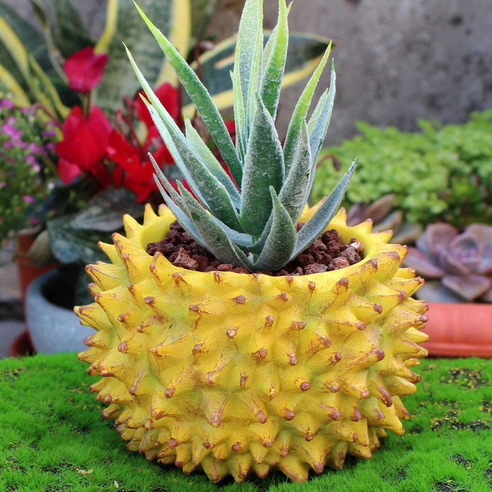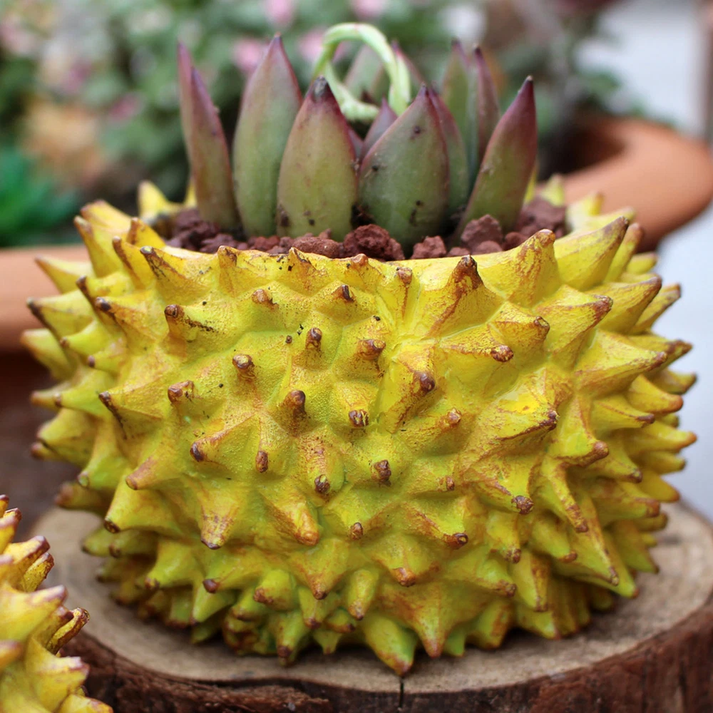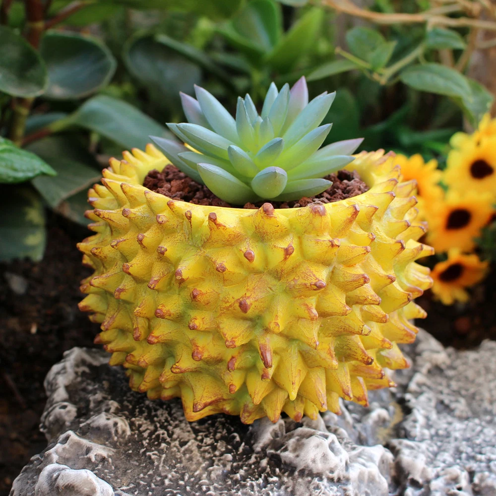 Feature: 1. Durian Shape Design: Desktop flowerpot features an exquisite durian design that stands out beautifully. Its unique, attractive aesthetic adds a touch of greenery to both indoor and outdoor spaces that would brighten up any corner. 2. Resin Construction: Expertly crafted with a well manufactured resin texture, the flower pot ensures durability and lightness. This feature makes it both easy to move around and effortless to clean, adding to its functional value. 3. Versatile Usage: Small succulent pot serves multiple purposes, it can be used as a home decoration, office decor or could add charm to your balcony as a mini landscape. Whether you're sprucing up your living room or uplifting your office decor, this flowerpot makes a stylish choice. 4. Ideal for Succulents: Create a vibrant garden ambiance by growing succulents in this flowerpot. Its design promotes optimal growing conditions, helping you cultivate healthy and beautiful plants effortlessly. 5. Perfect Gift: With its unique durian design, this succulent flowerpot makes a charming gift to friends and family, especially those with a green thumb. It's a simple yet thoughtful offering that combines functionality and style. Specification: Item Type: Durian Flower Pot Material: Resin Size: Approx. 11.2x11.2cm / 4.41x4.41in Weight: Approx. 256.00g / 9.03oz Package List: 1 x Durian Flower Pot