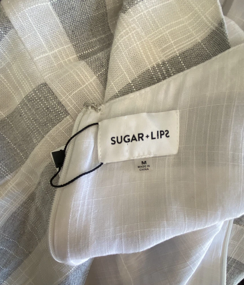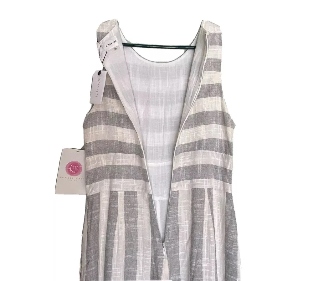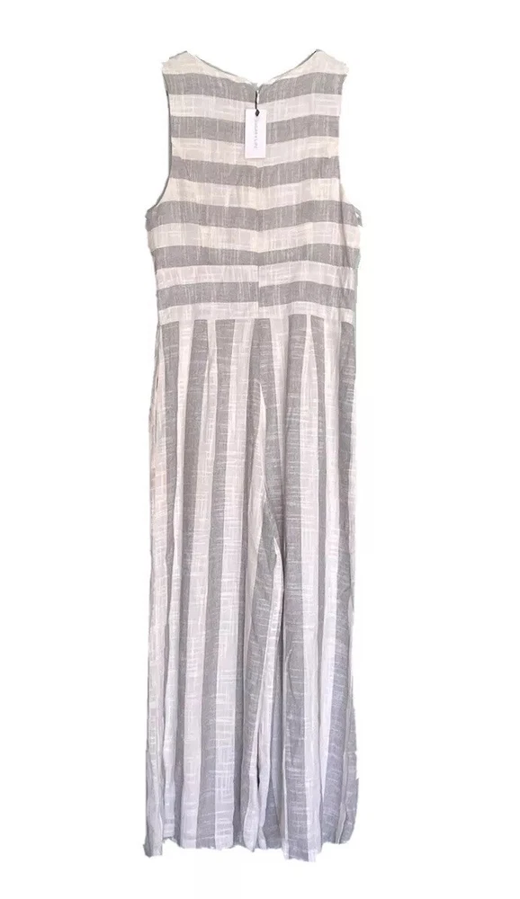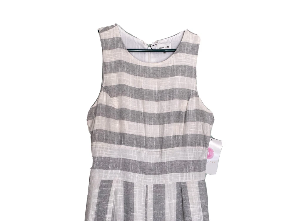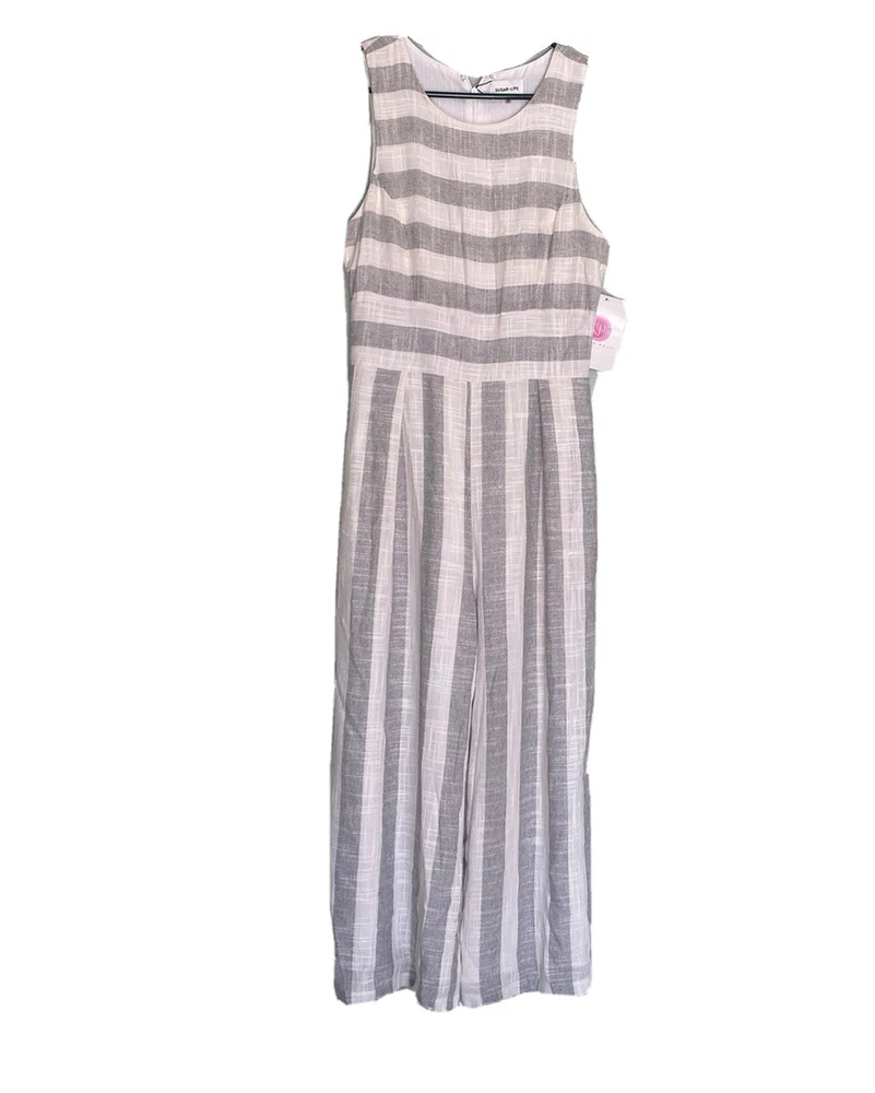 Sugar Lips Womens Linen Blend Jumpsuit Size Medium Gray Striped Sleeveless. New with tags. Pit to pit 17in. Waist 14.5in. Inseam 22in. Material does not stretch.