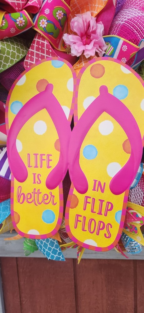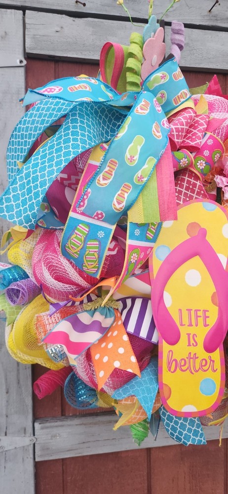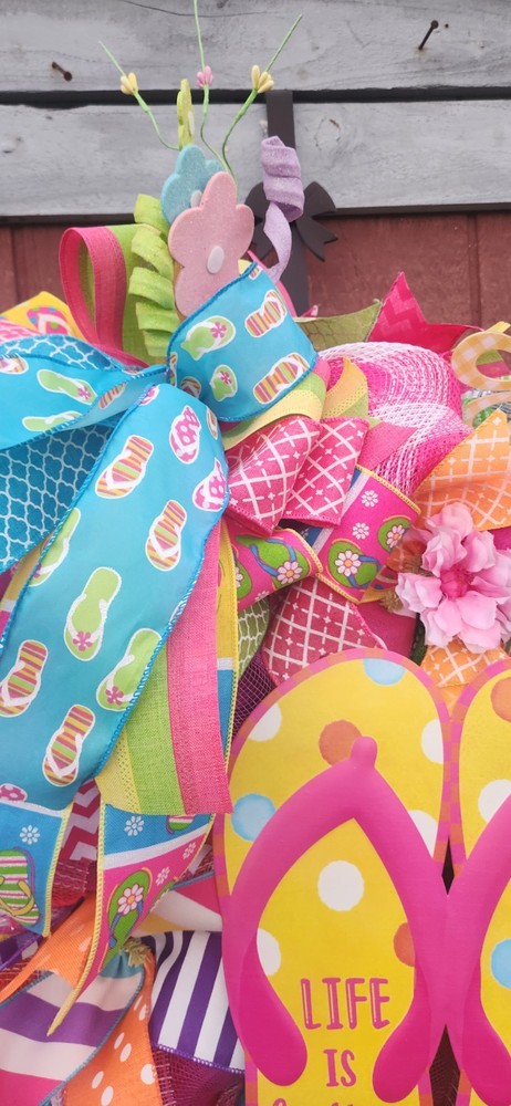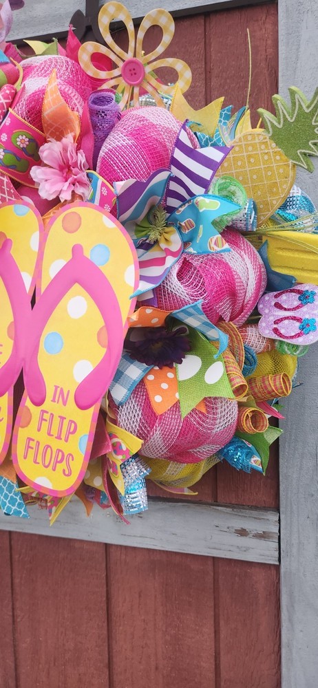 Add a touch of summer to your home with this handmade wreath hanger. The multicolor wreath is made of mixed materials and features a fun flip flop design. Perfect for the summer season, this artificial wreath is 30 inches in size and will make a great addition to any door decoration. Made in the United States, this wreath hanger is a great way to welcome guests into your home and add some seasonal decor to your space. Whether you're looking to spruce up your front porch or add some summer vibes to your living room, this wreath hanger is sure to do the trick.