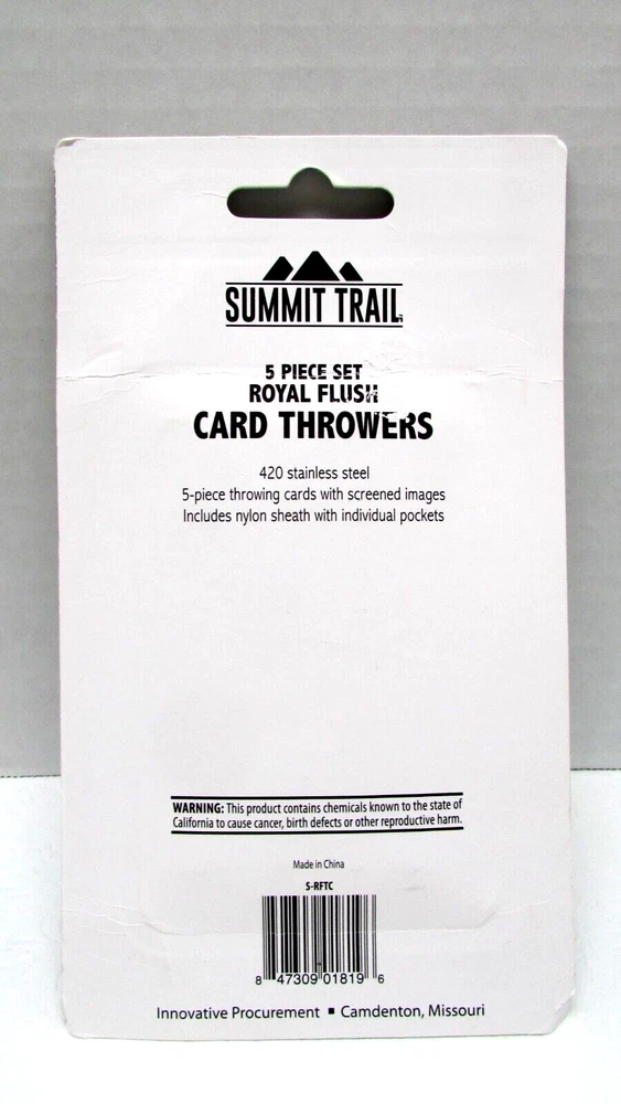 DESCRIPTION: You are purchasing a NEW Summit Trail Royal Flush Throwing Set aerodynamic metal 420 pc throwing cards These aerodynamic metal throwing cards are made from industrial 420 stainless steel to prevent warping, and specifically designed to help you hit your target. 420 stainless steel, 5 piece throwing cards with screened images includes nylon sheath with individual pockets. By Innovative Procurement in Camdenton, Missouri. UPC 847309018196. This comes from a smoke free home! I will combine shipping on multiple purchases! (Toys 2) SHIPPING INFO: Buyer to pay shipping costs. Items sold as is! Item to be sent via USPS. BIDDING and PAYMENT INFO: Winning bidder must make payment within 3 days of close of auction or item will be re-listed. ***BEFORE BIDDING*** * Please see pictures for more detailed information and condition of item; pictures are part of description. * Descriptions are to the best of my ability, remember what might be excellent or good condition to me may not be excellent or good to you. Please inquire with any questions. * Please see pictures for more detailed information and condition of item; pictures are part of description. * Most items are used & are sold "As is" unless noted differently in the description. You will get what is pictured. Multiple pictures with different views are taken to show condition. * Due to the item's age do not expect items to be in perfect condition and I may not describe every little scratch or spot. * Please note 'used' or 'previously owned' items will to some degree show some signs of normal use such as scuffs, scratches, chips, creases, small dings/dents, rust, spots, stains, dirt, dust, signs of installation/removal, previous owners name/initials and may have wear that you would not expect from purchasing a new item and any more noteworthy condition issues than such will be mentioned above. Item may need cleaning. * I have no control over shipping costs. It is what it is. All items are sold as is, where is. I will only accept returns if you find that I have misrepresented myself. Most of my items are vintage and will naturally show wear from age and use. This is an auction, and the sale of this item will be considered final. I have endeavored to photograph and accurately describe every item as to its condition and authenticity to the best of my ability. I am happy to answer any questions during the auction! PAYMENT: Payment must be received within 3 days of the closing date of the auction. Email me if you have any questions about payment. Your order will be shipped to the address registered with Ebay. If you want the item shipped to a different address, you must email me and receive a confirmation of your request. Otherwise, the item will be shipped to the registered address.