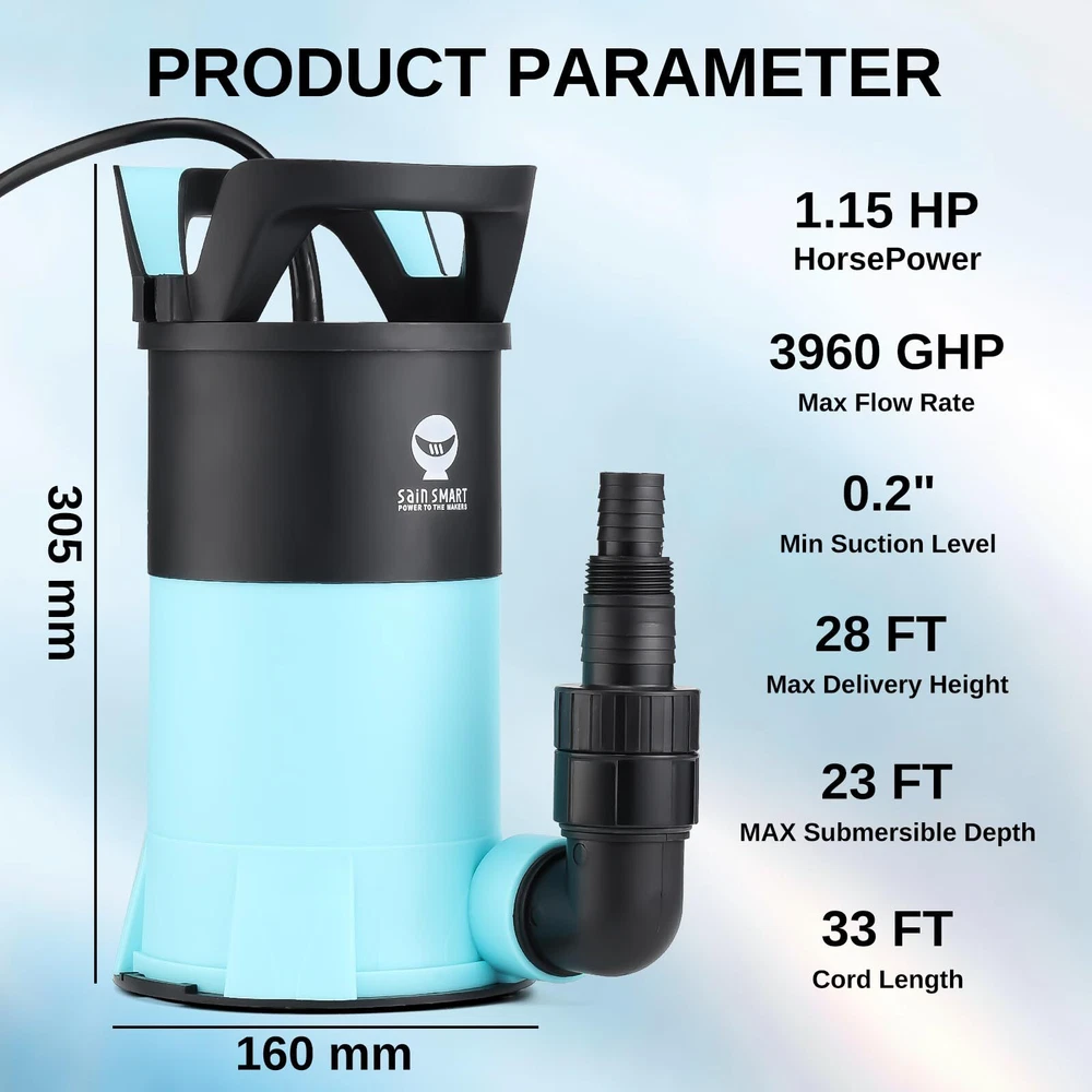 Powerful Flow : SainSsmart sump pump with a 1.15HP power motor drains water at up to 3960 gallons per hour. Featuring a powerful flow rate, it ensures efficient drainage even when the head is increased, and the flow curve drops Wide Applications: 1-1/2'' NPT discharge includes a 1-1/2'' elbow adapter, 3/4'' garden hose adapter, and 1" hose adapter, fitting 3/4'', 1'', 1-1/4'', or 1-1/2'' pipes/garden hoses. It's ideal for clean or dirty water, it’s perfect for draining hot tubs, water heaters, basements, gardening, and car washing High-Quality Materials: The water pump is made of thermoplastic material, reinforcing its durability and corrosion resistance. Equipped with a long power cord, it is easy to use in any corner Safety and Reliability: sump pumps are equipped with all-copper motors with overload and overheat protection to ensure stable performance and safety even after long periods of use Extended Continuous Operation: 850W submersible pump is built to handle prolonged usage without overheating, making it perfect for large-scale drainage tasks