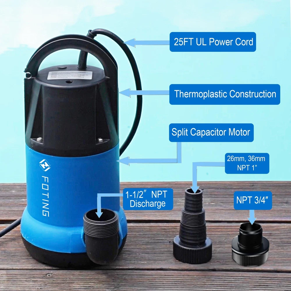 1HP 900W 3960GPH Electric Submersible Pump Portable Sump Pumps submersible water pump is great for draining garden pond, water tanks, pools, hot tubs, flooded areas, etc. It will be a necessary tool for every house. is a professional manufacturer of water pump over 20 years, committed to providing different kinds of pumps with excellent quality all over the world. We set up total quality managenment not only incoming inspection, 100% in-process audit by automatic machines, and final products testing but also the FFU test to customer's request. "Quality, Service and Reputation" are the principle of our culture, which make our products more competitive and outstanding on the market. Specifications: Horsepower: 1 HP Max Flow: : 3960 GPH Max. pump Height: 31 Feet Max. submersion Depth: 23 Feet Cable Length: 25 FeetVoltage/ Frequency: 115V/60 HZ NOTICE: Don't use the pump for any salt water, chemical or acid liquid, it may reduce the lifetime of pump. Package includes: 1 x submersible utility pump 1 x hose adapter 1 x detailed manual instructions EFFICIENT DRAINAGE: Utility pump with 1HP power motor for Draining water up to 4600 GPH( 76 GPM) at 5ft. Lift water up to 31ft of vertical height. Removing water to 1/5" of the surface. PORTABLE PUMP: Plug in to play while unplug to stop. Sump pump filters debris and removes water down to 1/5 inch from the surface. Handle up to 1/5″solids , ideal for pool pond draining hot tub and flooded basement window wells 4 DETAILS: 25FT power cord for greater range of use;Removable bottom easy to clean and maintain pump life; Rounded handle prevents cuts and comfortable to use;Thermoplastic housing for corrosion resistant and durable. QUICK TO CONNECT: Comes with a NPT 1-1/2" discharge size, a NPT 3/4" garden hose adapter and a hose adapter fits Ф1-1/2", Ф1" or NPT 1" inch hose. You can use different sizes of hoses depending on the flow ENERGY SAVING & SAFETY: Follows UL 778&746C standards for safety and 100% manufacturer tested, low noise and energy saving. Built-in automatic thermal overload protects the motor from burning out when dry running -AFTER SERVICE: Comes with 3-year after-sale service, Any inquiries or problems please feel free to contact our service team, there will be help for any concerns within 24 hours TIPS: Before using the pump, please submerge the pump into the water at an angle to allow any trapped air to escape