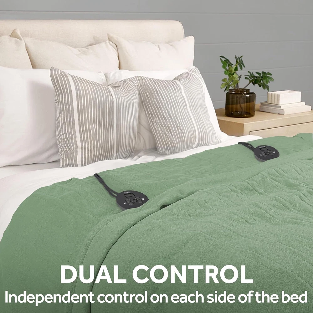 About this item 100% Polyester USER-FRIENDLY DESIGN: Electric blanket with digital controller and LED backlit blue display for easy viewing at night CUSTOMIZABLE WARMTH: 12 Heat settings allows you to select your ideal warmth level SAFETY FIRST: 12-Hour selectable auto shut-off and overheat protection for added peace of mind COMFY AND COZY: Comfy and cozy royal ultra fleece fabric for warmth and comfort, 100% high-quality polyester STYLISH COLOR: Matcha green color compliments your décor, great for your home or an ideal gift for family and friends