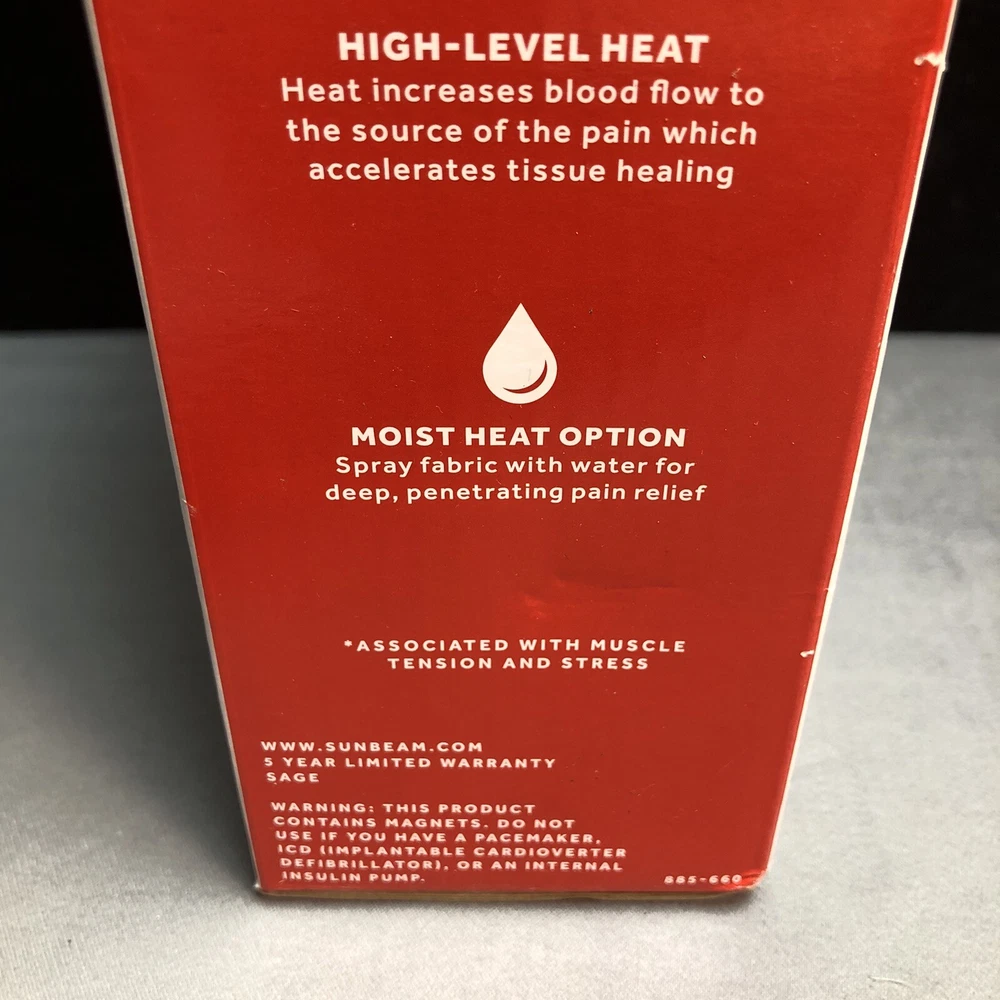 Country/Region of Manufacture:ChinaBrand:SunbeamUPC:053891134071Department:UnisexMPN:#198569Power Source:Electric, Power PlugType:Electric Heating Wrapgtin13:053891134071Manufacturer Warranty:5 YearsMaterial:Fabric