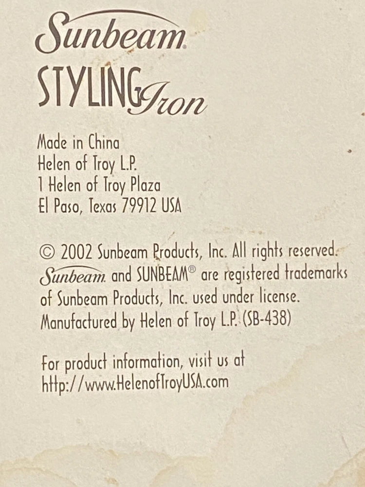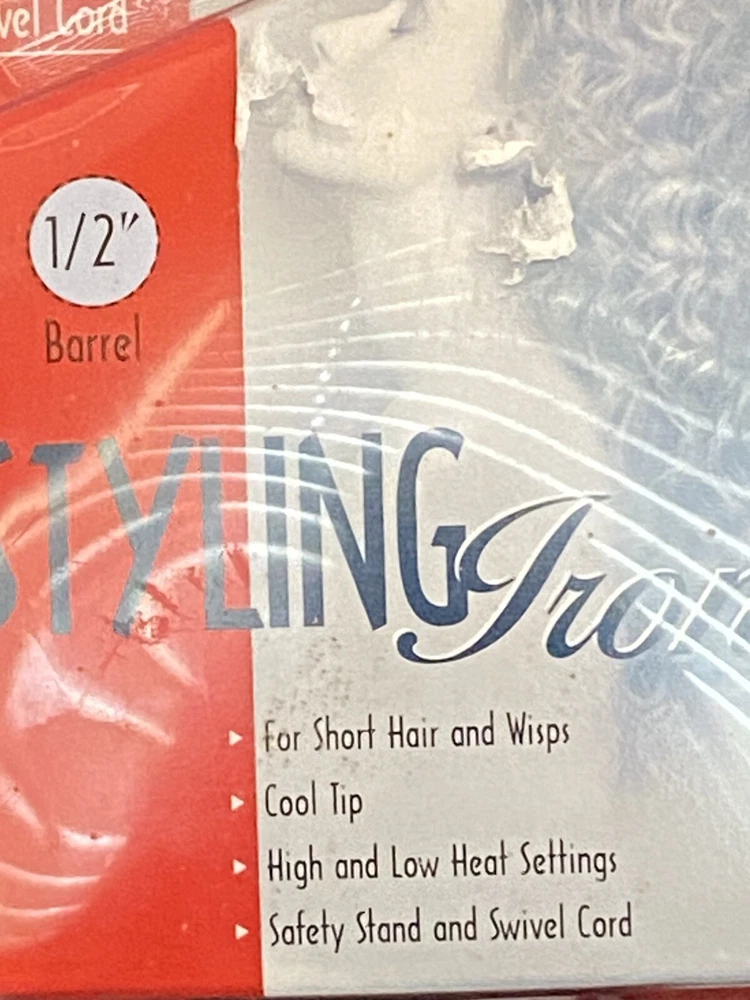 Sunbeam Styling Iron 1/2'' Barrel with Cool Tip New Get the perfect curls and sleek styles with the Sunbeam 1/2" Styling Iron! Designed for precision and ease, this classic 2002 model is ideal for creating defined waves, tight curls, or adding volume to your hair. The 1/2-inch barrel allows for versatile styling, while the swivel cord ensures tangle-free maneuverability. With a cool tip for safe handling and a built-in safety stand for secure storage, this styling iron is both convenient and reliable. Whether you're looking for everyday elegance or a glamorous touch, the Sunbeam styling iron delivers salon-quality results right at home. Don't miss out—get yours