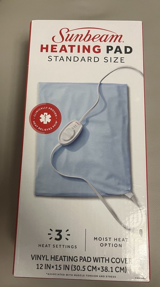 The Sunbeam Heating Pad for Pain Relief is a standard size ultraheat electric heating pad with 3 heat settings, making it perfect for soothing aches and pains. With a professional service guarantee and 30-day money-back guarantee, you can trust that you'll be satisfied with this product. The light blue color and compact dimensions of 12x15 inches make it easy to use and store. The Sunbeam brand ensures quality and reliability, while the ultraheat technology provides efficient and effective pain relief.