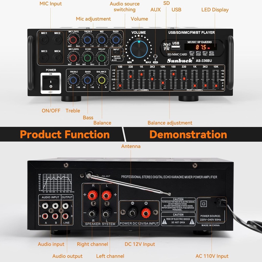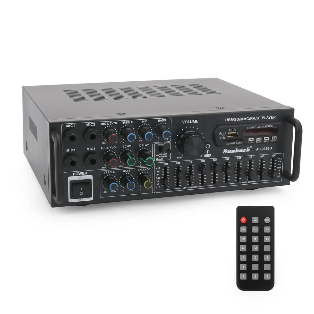 Product Description 2000W Peak Stereo HiFi Power Amplifier bluetooth 5.0 Karaoke FM USB EQ mixer SUNBUCK with Remote Control for Car Home Note: The rated power of the Power Amplifier is 400W. Please note that it does not exceed 400W when using it, otherwise it will easily lead to overheating and damage to the machine. This machine needs to be connected to the TV, computer, and CD through the audio input interface. If there is no sound, press the audio source switch button. There is no optical fiber interface. Thank you! Features: 1. A set of speakers is a suitable amplifier for small PARTY 2. Two signal inputs: DVD signal and AUX signal 3. LINE output, signal output can be connected to active subwoofer or other equipment signal source 4. Center surround output, 2 channels can be adjusted by left and right balance 5. With remote control(Button Cell is Included) 6. Bluetooth 5.0 7. With FM radio 8. 5-band EQ mixer 9. Reverberation, fine tuning, balance 10. SD, USB interface, 4 microphone inputs. 11.With microphone reverb and delay adjustment Specifications: Model: AS-336BU Size: 290×95×240mm/11.4x3.7x9.4in Rated voltage: AC 110V 50/60Hz, DC12V Plug Type: US Plug Rated Power: 400W Peak Power: 2000W Rated frequency: 20KH - 20KHz Signal to noise ratio: 90dB Standard impedance: 4 to 16 ohm Type of power amplifier: AV power amplifier Channel: 2.0 channel Total harmonic distortion: ≤ 0.5% Signal input sensitivity: 200mv (± 30mv) Microphone input sensitivity: 9 mv (± 2mv) Recording level output: 1V Auxiliary level output: 1V Support:USB Disk/SD Card Color: Black Packaged included: 1 x Audio Power Amplifier 1 x Remote control 1 x User Manual Shipping Returns Warranty Feedback About US ✔ Delivery Time: 3-5 business days (continental U.S.). ✔ Order Processing: Ships within 3 business day (Mon-Fri, excludes holidays). ✔ Tracking Info: Provided automatically via eBay. ✔ All orders will be shipped through USPS First Class, UPS and Fedex depends on the weight of the items. ✔ Shipping notification will be emailed to you once package has been shipped Fast & Reliable Shipping – Your order is our priority! We package all items with care to ensure safe arrival! Tracking number emailed as soon as your order ships! 🌍 Ships from U.S. Warehouse – No long waits! ULTRA-FAST SHIPPING – Because you shouldn't wait! We guarantee on-time delivery or your shipping fee back! 60-Day Hassle-Free Return Policy We offer 60-day free returns for your peace of mind. To ensure a smooth process, please contact us first before opening a return request—we'll gladly help resolve any issues! ⭐ Return Requirements: ✅ Unused & in original packaging ✅ Contact us immediately if the item is defective/damaged (photos/video required) ✅ Repack securely to prevent shipping damage ⚠️ Important Notes: • If returning due to change of mind, please select: "Changed mind" or "Didn't like item" Defective/damaged items? Contact us immediately with photos/video proof • Incorrect return reasons (e.g., falsely claiming "defective") may result in a refused refun d. ⭐ Return Process: • Contact us → We'll provide return instructions. • Ship the item back with tracking (recommended). • We inspect returns within 3-5 business days. Approved refunds are issued to your original payment method (processing time varies by bank). ⭐ Need Help? Message Us First! We're happy to offer alternative solutions, including replacements or discounts, before you proceed with a return. Your satisfaction is our top priority! No-Questions-Asked Warranty ⭐ HASSLE-FREE WARRANTY • 90-365 Day Coverage (varies by product - see listing details) • No Return Required for claims under $50 - we ship replacements immediately ✖ Exclusions: • Physical damage (drops/accidents) • Installation errors (YouTube tutorial links provided) • Modified/tuned vehicles Professional Installer Warranty ⭐ CERTIFIED INSTALLATION WARRANTY ✔ installed by licensed mechanics ✔ Free Technical Consultation before installation ⭐ Feedback & Satisfaction Policy Your 5-Star Reviews Help Us Grow! We're committed to your complete satisfaction. When you receive your item and are happy : ✅ Please consider leaving positive feedback about your experience ✅ Share what you loved (fast shipping? great packaging? accurate description?) Our Promise to You: ✔ 100% satisfaction guarantee - we stand behind our products ✔ Open, honest, and timely communication ✔ Always respond within 24 hours to any concerns Before Leaving Feedback: ⭐ Contact us first if anything is less than perfect ⭐ Allow us to make it right (replacement/refund/store credit) ⭐ Negative feedback won't solve issues - but we will! Important Notes: • Feedback about shipping carriers should go to their official channels • eBay cases opened without contacting us first void satisfaction guarantees We value your voice - let's work together for a great eBay experience! Our company [Amotopart] begins our business in ebay since 2006. We Mainly sell Bike, Sport goods, Home & Garden products, Computer Accessories, Consumer Electronics, Industrial and more to meet your needs. Our Advantage: [High Quality] - We focus on R&D, cooperating with professional manufacturers, ensuring that we provide our customers with top quality and innovative products. [Great Price] - We try our best to offer you the best price in all markets. [Excellent Customer Service] - We try our best to service our customers all time, professionally and sincerely solve your problem and reply quickly within 24 hours(excluding weekends). [International Warehouse] - We have many warehouses around the world, such as in USA, UK, AU and so on, ensuring the fastest shipping for your orders. We value honest and fair business with our customers. We welcome you to contact us and look forward to working with you! Shipping ✔ Delivery Time: 3-5 business days (continental U.S.). ✔ Order Processing: Ships within 3 business da