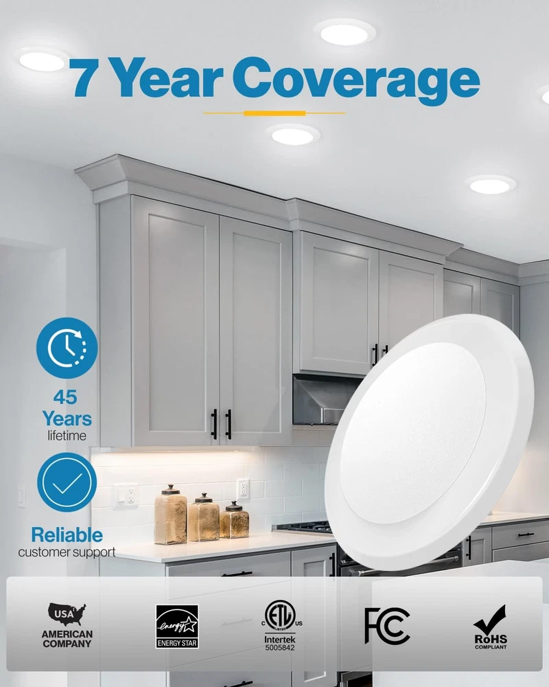5/6 Inch Flush Mount LED Disk Downlight, 15W DIMMABLE - Seamless dimming capabilities (10%-100%) that fit any mood or decor. Our sleek disk LED recessed lights give off sunlight-like quality (CRI90+) for true color rendering, ideal applications include bedroom, kitchen, living areas, lamps and offices. SAVE ENERGY - Lower your energy consumption instantly (up to 85%) by converting to LED. SIMPLE INSTALL - Sunco's LED Disk Downlights can be direct wired to a 4"/6" junction box which means they do not need a can. Directly install to the ceiling for instant bright light in your kitchen, family room, bedroom, bathroom, and common areas of your home or office. SUNCO BENEFITS - 7 Year Protection! Sunco is proudly based in the USA, offering quality products at affordable prices backed by industry-leading warranties and knowledgeable support specialists.
