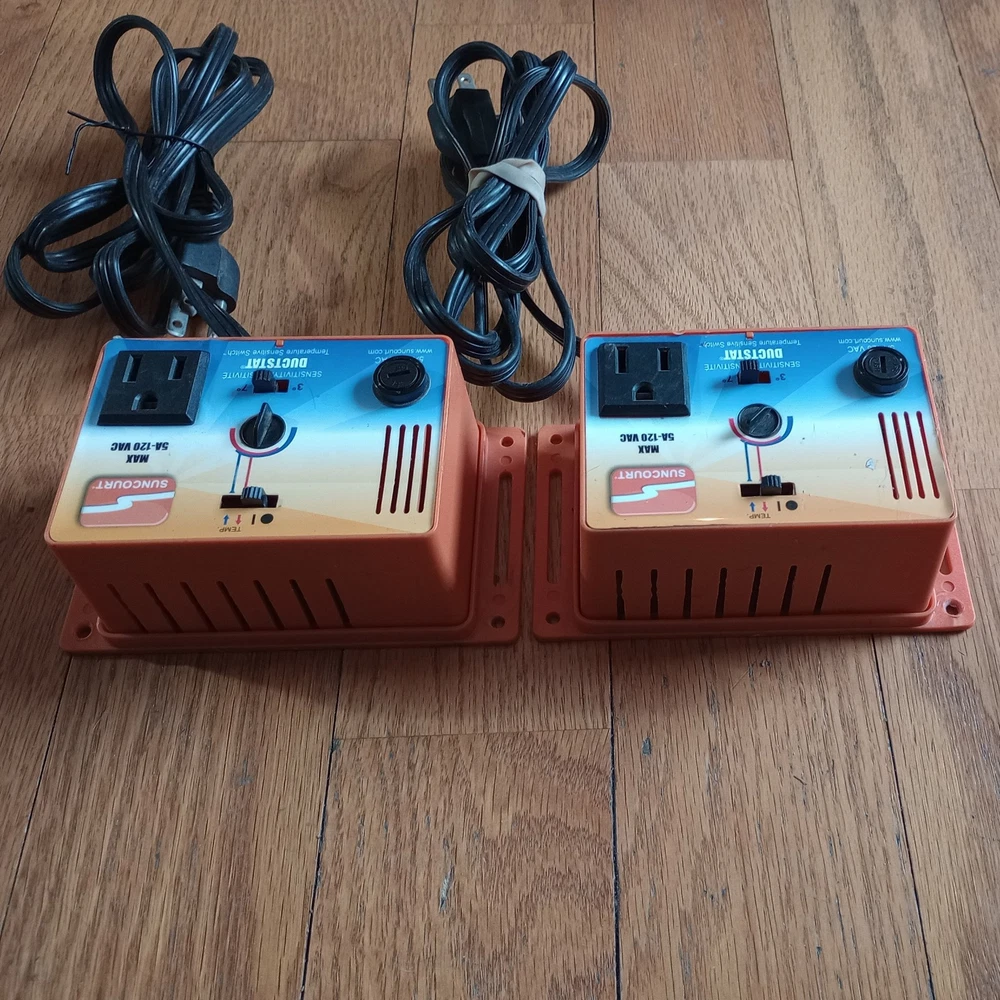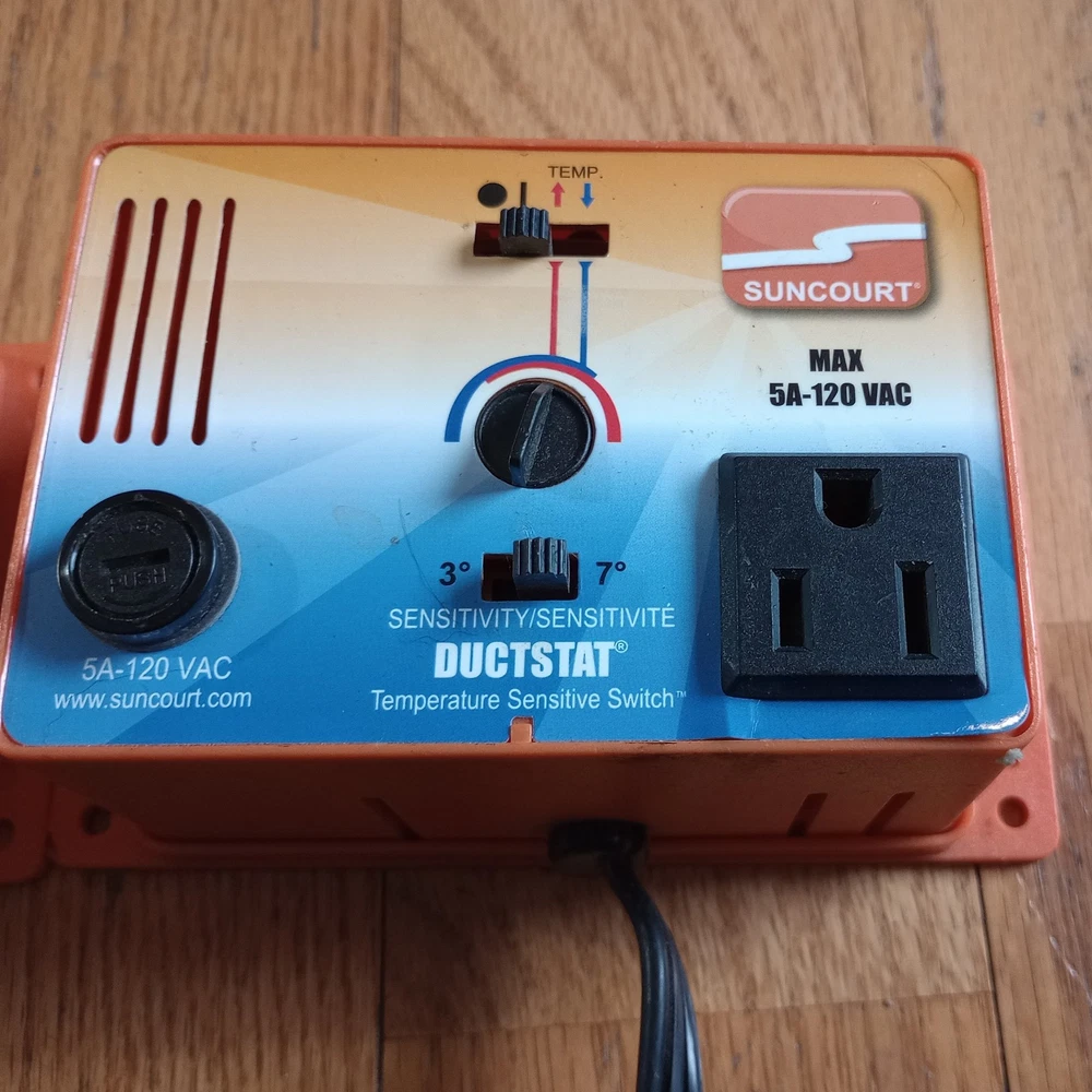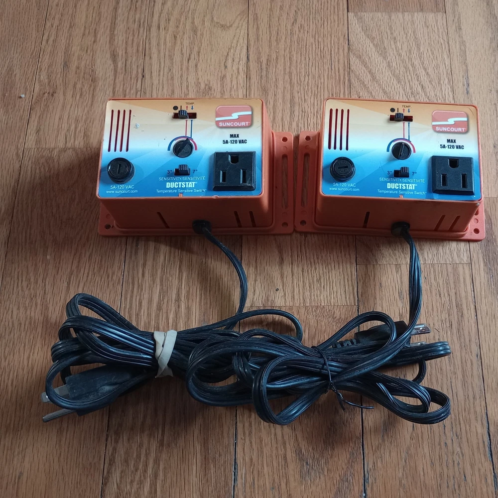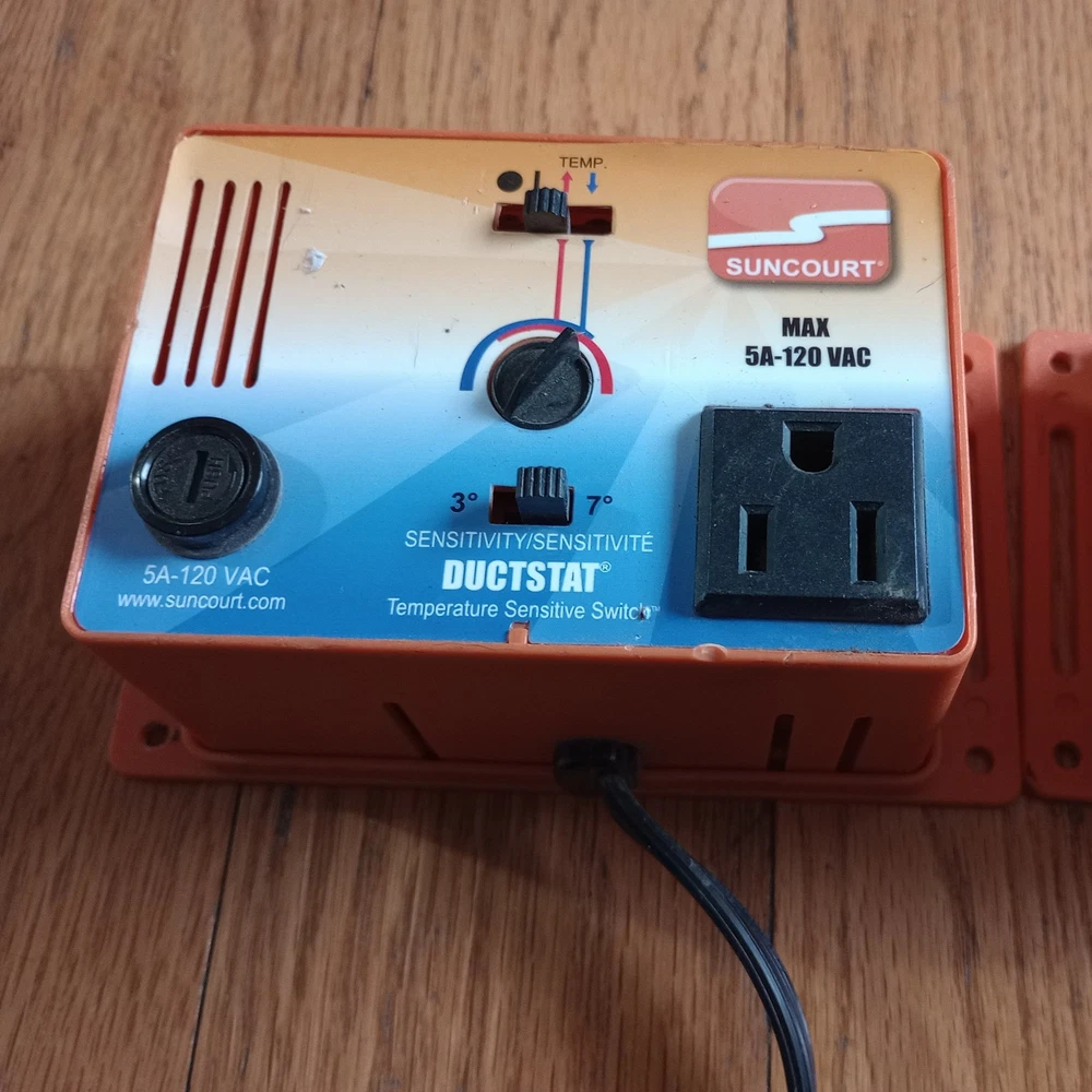 Brand Suncourt - ( Set of2 ). Model NameDS100 Controller TypePush Button Color Orange Specific Uses For ProductTemperature control in HVAC systems, powering inline fans, controlling room temperature. Temperature Control TypeManual TURN ON/OFF DEVICES - This inline thermostat is an economical way to turn a 110 volt device on or off due to a customized temperature rise or fall. 5 Amp capacity. MULTIPLE USES - You can use the Suncourt DuctStat to source power to inline fans in ductwork, heatlamps and light bulbs, or any variety of fans to help control room temperature. ADJUSTABLE AND CUSTOMIZABLE - When the thermistor (temperature-sensing device) detects a change of temperature from your set point, the DuctStat will activate. PAIR WITH INDUCTOR FANS - A common, and preferred use for the duct stat is just ahead (downstream) from the inductor fan. But anywhere on a duct where it can sense heated or cooled air will work. GREAT FOR ALL SEASONS - Whether you are trying to keep things cold in the summer, or things warm throughout winter with the simple flick of a switch you are bouncing between heat and cool.