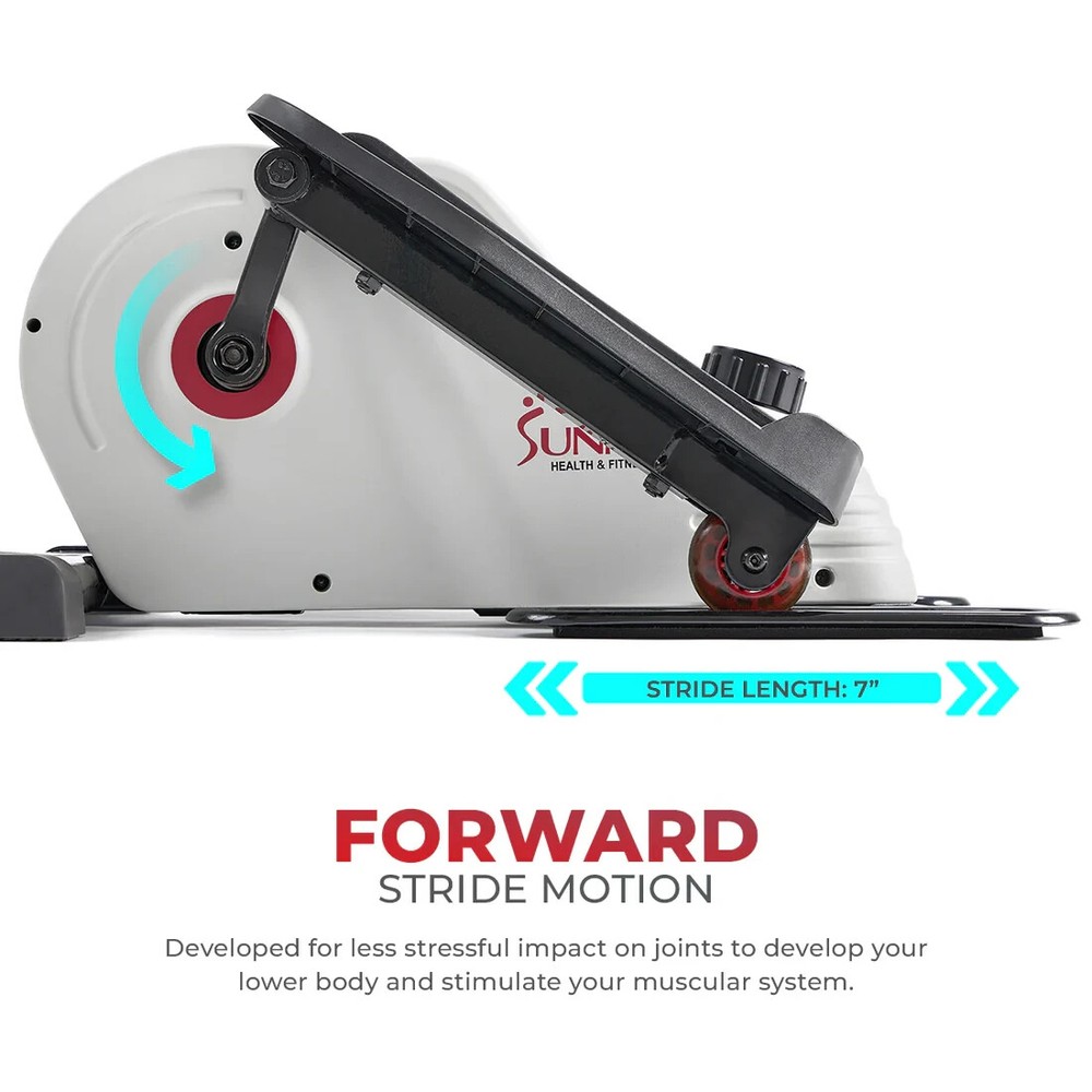 Description Fight against a sedentary lifestyle with this easily transportable magnetic elliptical, with a low range of motion and integrated wheels along the stable frame. From Sunny Health & Fitness. Includes SF-E3872 elliptical, hardware/tools, one LR44 battery, and manual Eight magnetic resistance levels Central digital monitor tracks speed, time, calories, and distance 7" range of motion Large textured ergonomic foot pedals Floor stabilizers Transportation handlebar Measures approximately 22.83"L x 18.31"W x 11.02"H, weighs 24.2 lbs.