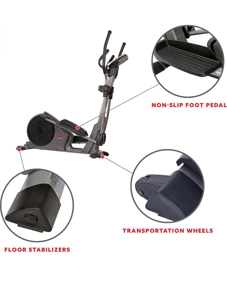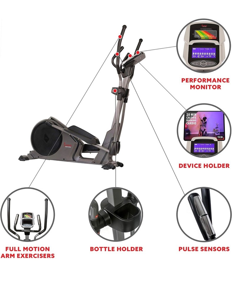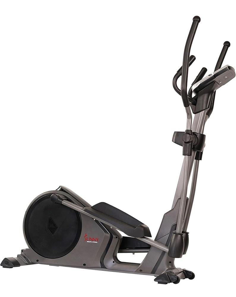 The Sunny Health Programmable 16 Electro-Magnetic Elliptical Cross Trainer Machine is designed for gym & training activities. It features magnetic resistance and is a part of the Sunny brand.