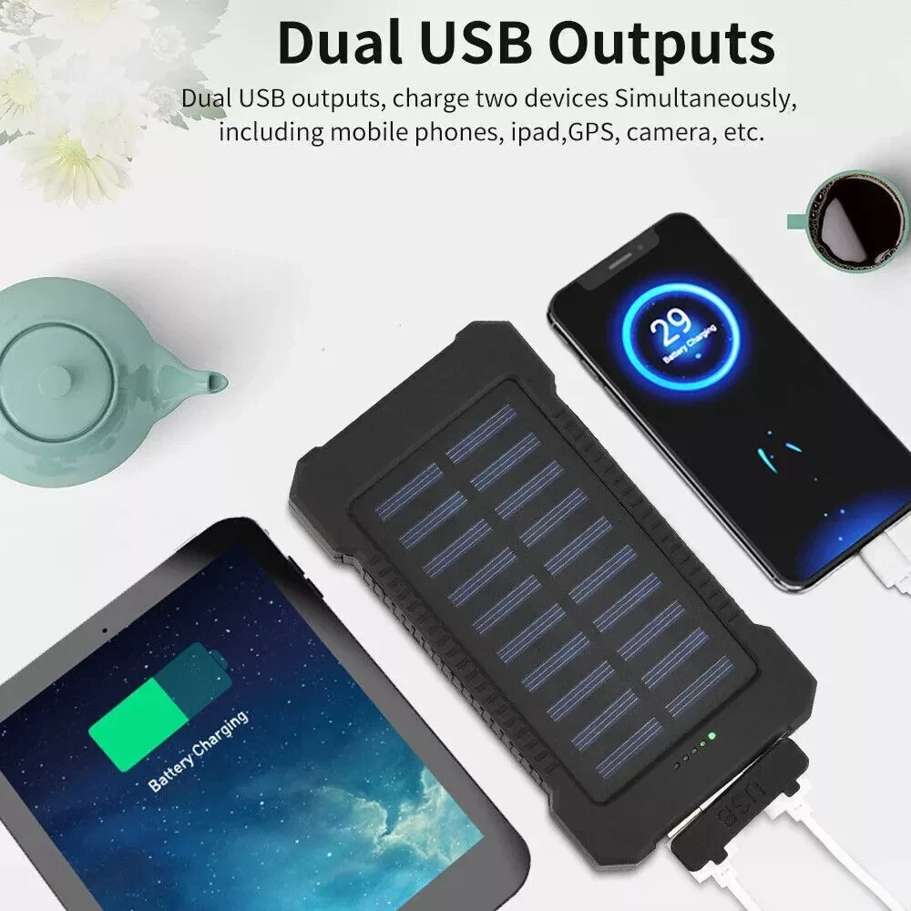 Solar Power Bank 30000mAh, Solar Charger Three Modes Flashlight-Steady/SOS/Strobe IPX7 Waterproof/Dustproof/Shockproof External Battery Pack 3 USB Charging Ports Connector Type Micro USB, USB Type A Battery Capacity 30000 Milliamp Hours Compatible Phone Models : IPhone 14/14 Plus/14 Pro/14 Pro Max/13 Por Max/13 Mini/12/11/XR/XS Max; iPhone 8 Plus/8/7 Plus/7/6s Plus/6 Plus/6/SE;, Samsung Galaxy S22 Ultra,S22+,S22,S21 S20 S10 S9 Plus,Samsung Galaxy S 8,Samsung Galaxy S 8 Plus,Samsung Galaxy S 7,Samsung Galaxy S 6,Samsung Galaxy S 6 Edge,Samsung Galaxy S 5, Note 8 oneplus 2 oneplus 5t s8 plus samsung galaxy note 8 samsung galaxy s8 samsung note 8 Samsung S8, Google Pixel LG/Nexus/Motorola cell smartphone and other USB Smart Devices. About this item 【30000mAh Larger Capacity & Safer Battery】The solar charger uses high-density premium li-polymer battery, which makes the charger more compact and safer than others. Long lifespan, large capacity offers you multiple charges, freeing you worries of power outage anytime anywhere, Definitely a reliable power sources for you. 【Three Modes Flashlight for Emergency Use】The solar power bank is equipped with a three-modes flashilght(Steady-SOS-Strobe),Unlike others without SOS/Strobe light, this portable charger could be a life savior in the emergency or the wild. A full charge can power the light up to 120hours, One Metfut phone charger in hand, all worries are behind. 【Solar Panel Recharging 】We uses only high quality solar panel, higher conversion performance allows the charger to recharge itself by absorbing the sunlight, Ensuring you have the environmentally friendly green energey on hand. 【Sturdy-Durable IPX7 Shockproof Waterproof】The external battery pack is made of super solid high-strength ABS and PC materials, heat-resistant, dust-resistant and shock-resistant.the whole outer case seamlessly seals and protects the internal structure of ther battery, the bottoms 3 charging ports are all well protected by the skin-feel high-elasticity rubber cover. 【Multiple Ports & Wide Compatibility】The solar power charger is designed with three usb charging ports, Two USB outputs allows you to charge two devices simultaneously, The input port is for recharging the battery itself, the recharging cable is included, saving you cost of getting the charging cables, it is widely compatible with most usb charging devices. On Jan 9, 2025 at 02:16:26 PST, seller added the following information: