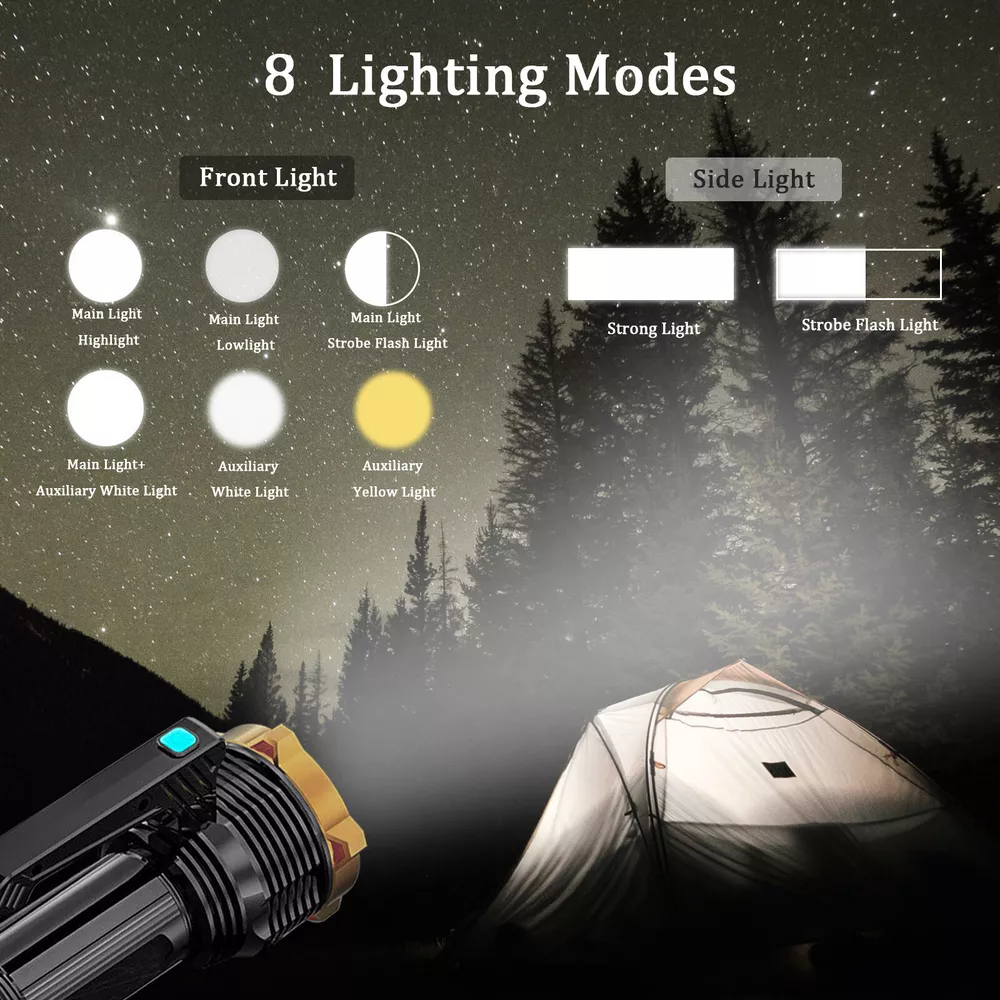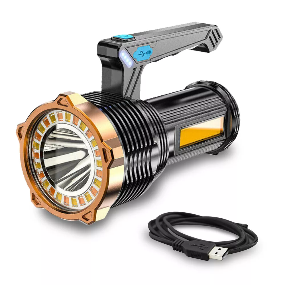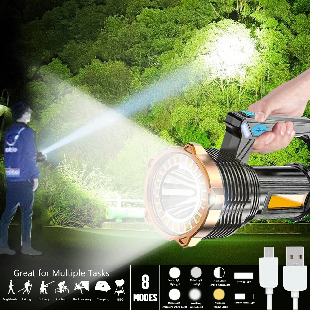 Product Feature: Super Bright: High-intensity wick with more light. 8 Lighting Models: ①Main Light Highlight②Main Light Lowlight③Main Light Flash④Main Light+Auxiliary WhiteLigh⑤Auxiliary WhiteLigh⑥Auxiliary YellowLight ⑦Side WhiteLight⑧Side YellowLight. It can service as a front flashlight or turn on the side light as a table light. Waterproof: IP44, fully sealed body. No worries about rain and water, it can use for rain days, but can't use diving. USB Charging and Indicator Light: Charge by USB ports. Real-time power display (25%/50%/75%/100%) to keep track of battery power, and charging indicator function. Applications: Built-in rechargeable lion battery of 1200mAH. Perfect for camping, hiking, fishing, sailing, ride, outdoor, etc. Product Specification: Type:Handheld Flashlight Material:ABS Shell Color:Black Light Source:White Light/Yellow Light Endurance:3~10 Hours Size:155*75mm/6*3in Waterproof:IP44 Daily Life Waterproof (Can't Dive) Battery:Built-in Rechargeable Lithium Battery Capacity:1200mAH Power Display:25%/50%/75%/100% Charge:USB Cable (Included) Package Included: 1 x Rechargeable Handheld Flashlight (Built-in Battery Included) 1 x USB Cable 【USB rechargeable large-capacity】: flashlight rechargeable uses a 2000 mA large-capacity lithium-ion battery, Endurance 3~10 hours 。The small flashlights powerful can be charged by a power source such as a laptop computer, a car charger, a power bank, etc. is charged through a USB port. 【Small&light】: rechargeable spotlights handheld,rechargeable led flashlight, led flashlight with three brightness levels (high-low flash) on the front. The spotlight is a fixed focus, or turn on the side light as a table light. the led rechargeable flashlight for different situations to provide you with bright light. 【camping flashlight waterproof&anti-skid】: The powerful flashlights is made of high-quality ABS material. spotlight flashlight has anti-skid, explosion-proof, and shockproof functions. Enhanced waterproofing can prevent it from splashing water from all angles. flashlights for camping Suitable for outdoor environment, bad weather conditions. 【Practical Side Lights】: handheld light side floodlights are adjusted for different situations to provide you with bright lights so that your flashlight can be used in various scenes, camping lights, work lights, Inspection Light, desk lights. So that you can use it conveniently. 【Emergency flashlight】:flashlights for emergencies is suitable for family emergencies, car maintenance, typhoons, power outage maintenance, manual reading at night, evening walks, camping accessories clearance, hiking, adventure, and fishing. Led Flashlight Rechargeable USB Torch Tactical Light Super Bright Spotlight Handheld Portable Lamp with COB Side Searchlight High Lumens Zoomable Emergency Camping Accessories Inspection Light Emergency Light Military Police Portable Ultra Bright Hiking Small High Performance Compact Powerful High Powered Flashlights Lamp high lumen Worklight Adjustable Focus Work light Waterproof Dimmable Brand Unbranded MPN Does Not Apply Features Adjustable Focus, Batteries Included, Handheld, Rechargeable, Strobe Light, USB Rechargeable, Waterproof Battery Type Built- in battery ( Include) Type Flashlight Model Searchlight Spotlight Portable Power Source USB Material ABS Lighting Technology LED Color Black Battery Included Yes