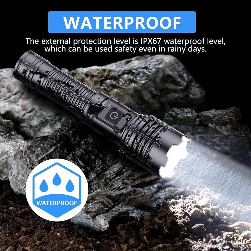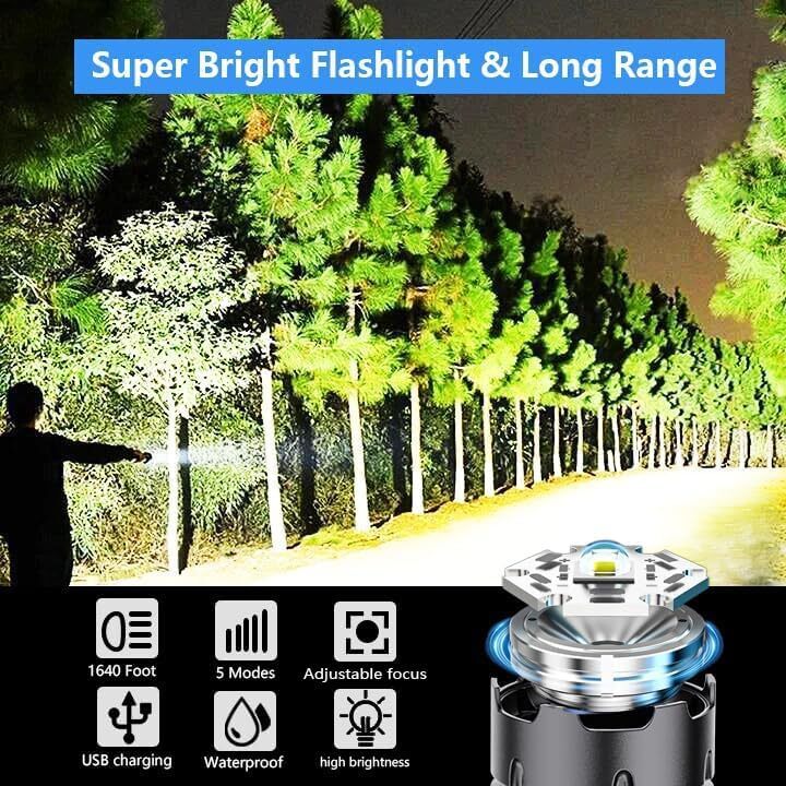 Flashlights High Lumens Rechargeable - 990000 Lumen Led Black Product Details Special Feature: Long Throw Flashlights High Lumens, Adjustable Focus LED Rechargeable Flashlight, Adjustable Light Modes, Rechargeable Flashlights, High Powered Flashlight Long Throw Flashlights High Lumens, Adjustable Focus LED Rechargeable Flashlight, Adjustable Light Modes, Rechargeable Flashlights, High Powered FlashlightLong Throw Flashlights High Lumens, Adjustable Focus LED Rechargeable Flashlight, Adjustable Light Modes, Rechargeable Flashlights, High Powered Flashlight See more Color: Black Power Source: Battery Powered Light Source Type: LED Rechargeable Flashlights Material: Aluminum 【Powerful flashlights & Brightest flashlight】:Rechargeable flashlights high lumens Built-in advanced super bright LED chip, with a powerful 990000 lumens output, its beam can pass through dust and fog well, especially suitable for foggy and rainy days with low visibility. It can easily illuminate light up a room up to 2000 square feet with ease. We can even focus on objects up to 1500 feet away, about the length of 3 football fields! A good led rechargeable flashlight suit is also makes the perfect gift for friends and family 【Upgraded Fast Charging】 This USB flashlight is equipped with 2 charging ports, a USB-C port for charging and a standard USB port for discharging, which can be used as a power bank in an emergency. When driving, you can connect the car charger to charge it. The rechargable flashlight can be charged and discharged more than 50000 times. 【Waterproof Flashlights】Led flashlight is made of aviation grade aluminium alloy. The solid body means excellent shock resistance, and even if run over by a truck it still works! Built-in high-stength sealing rubber waterproof ring, suitable for rain, snow or other bad weather. Waterproof, non-slip, and compact design make it a pocket flashlight for all outdoor activities, camping, hiking, fishing, and a powerful emergency flashlights 【5 Modes & Adjustable Focus】: This high powered flashlight has 5 modes: High/Medium/Low/Strobe/SOS. The smooth current conversion system can also better protect the flashlights chip, thus prolonging the service life. We can stretch the head to change the focal length and beam size, it has more powerful long throw in spotlight and wider field of view in floodlight 【Package 】 You will get: 1X rechargeable led flashlight, 1X USB universal charger, 1X USB charging cable, 1X storage box. You will be amazed by the brightness, quality, lifespan and performance of the led flashlight rechargeable