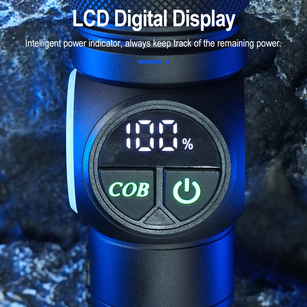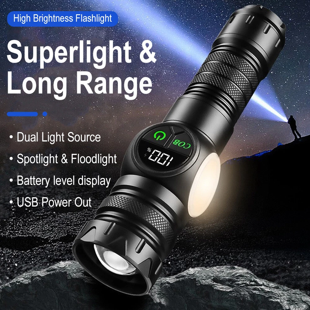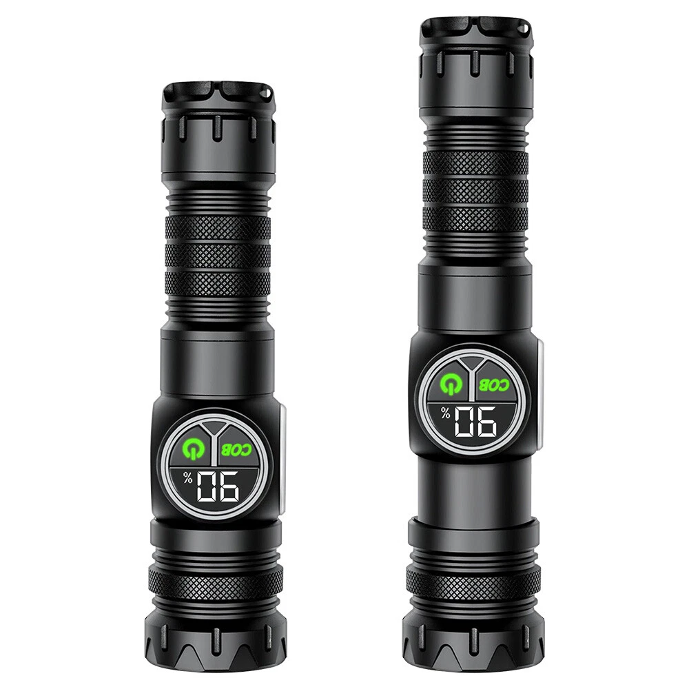 Product Description: Material: High-quality aviation-grade aluminum alloy material + convex lens lens, anti-rust and anti-fall, long service life. Process: The surface is hard oxidized, wear-resistant, not scratched, and feels good. Design: The strong magnetic design at the tail of the flashlight can be adsorbed to any iron object, freeing hands. Charging Method: Smart USB charging, compatible with a variety of charging methods, can be used in computers, vehicles, charging plugs, etc., and can also be used as a mobile power source for emergency charging of electronic products when necessary. Use Battery: The internal wiring of this product adopts a high-efficiency booster circuit to maximize the use of the battery. You can use 1 3.7V rechargeable battery, or you can use 3 AAA batteries, you can choose according to your preference. Power Display: LED power display the power consumption jumps and decreases in turn, the LED flashes when charging, and the LED is fully on when fully charged. Lighting Method: Level 5 main light: super bright, strong light, medium, SOS, strobe 4-level COB light: white light strong light / white light weak light / red light strong light / red light flashing Any gear, long press to turn off Suitable for: Hiking, camping, self-defense, teaching, searching, hunting, daily carry, night riding, caving, night fishing, patrol and various outdoor activities. Specification: Colour: Black Lamp beads: LED+COB LED Power: 20W Lumen: 10000LM Charging method: Type-C charging Use battery: 3*AAA battery(NOT included) /1x 3.7V Battery(included) Zoom mode: telescopic zoom Maximum range: 200-500 meters Waterproof grade: IPX4 Size: 6.69*1.65*1.37 inch Gross weight: 217g Type of Packaging: 1* flashlight 1* charging cable 1* battery compartment 1* anti-lost rope 1* battery
