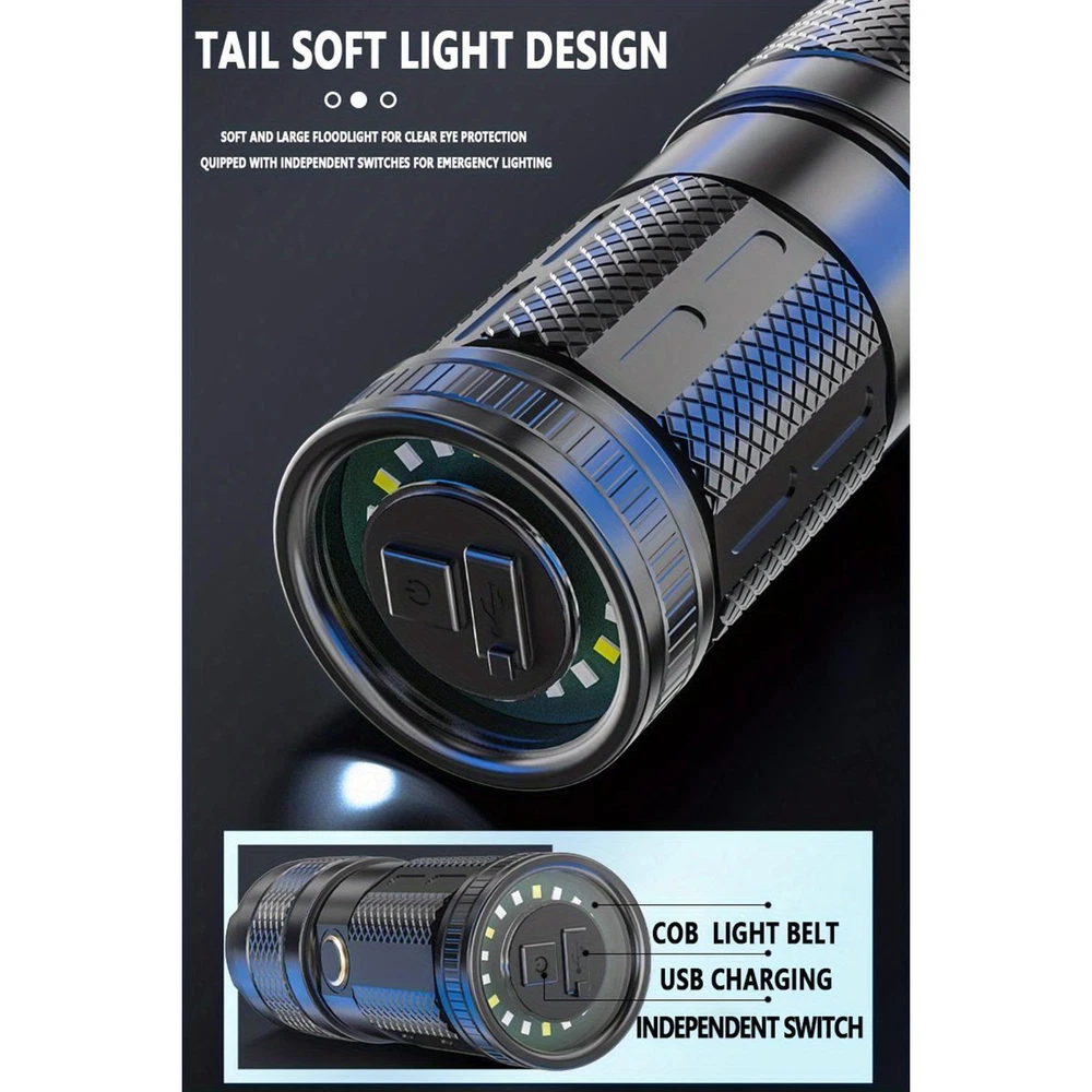 Product Description: 1. high brightness spotlight core, new zoom, high beam without grille, tail soft lighting, power outage can be used in emergency. 2. five-stage light change: strong light - medium light - low light - burst flash - SOS distress. 3. Free switching, infinitely telescopic zoom, contraction of the light that is floodlighting. 4. Tail light adopts 6 SMD chip lamp beads, translucent frosted lampshade luminescence is soft and not blinding, suitable for emergency reading and writing in case of power failure. 5.Type-c fast charging design, fast charging, long service life. 6.Lotus style attack lamp head, quickly break glass, can easily break car glass in emergency. 7.Life-grade waterproof, strong isolation of dust, dirt and water damage. Product Specifications: Light source colour: white light Gear: strong light / medium light / low light / burst flash / SOS. Control mode: intelligent one button switch Charging method: Type-c fast charging Size:145mm x 53mm Waterproof function:IPX3 Focus Mode:Telescopic focusing Material:ABS Lighting time:5-12 hours Package Includes: 1*Flashlight