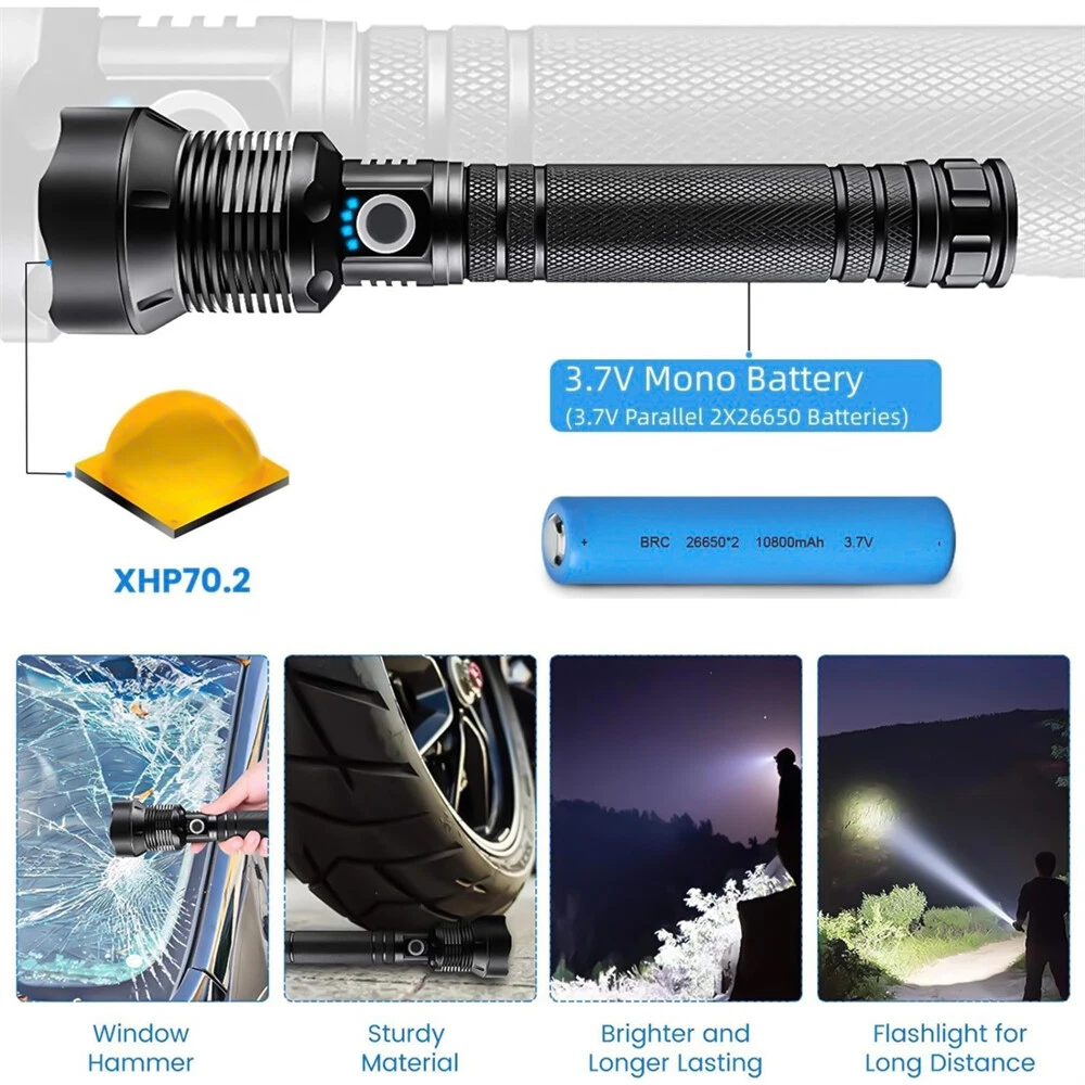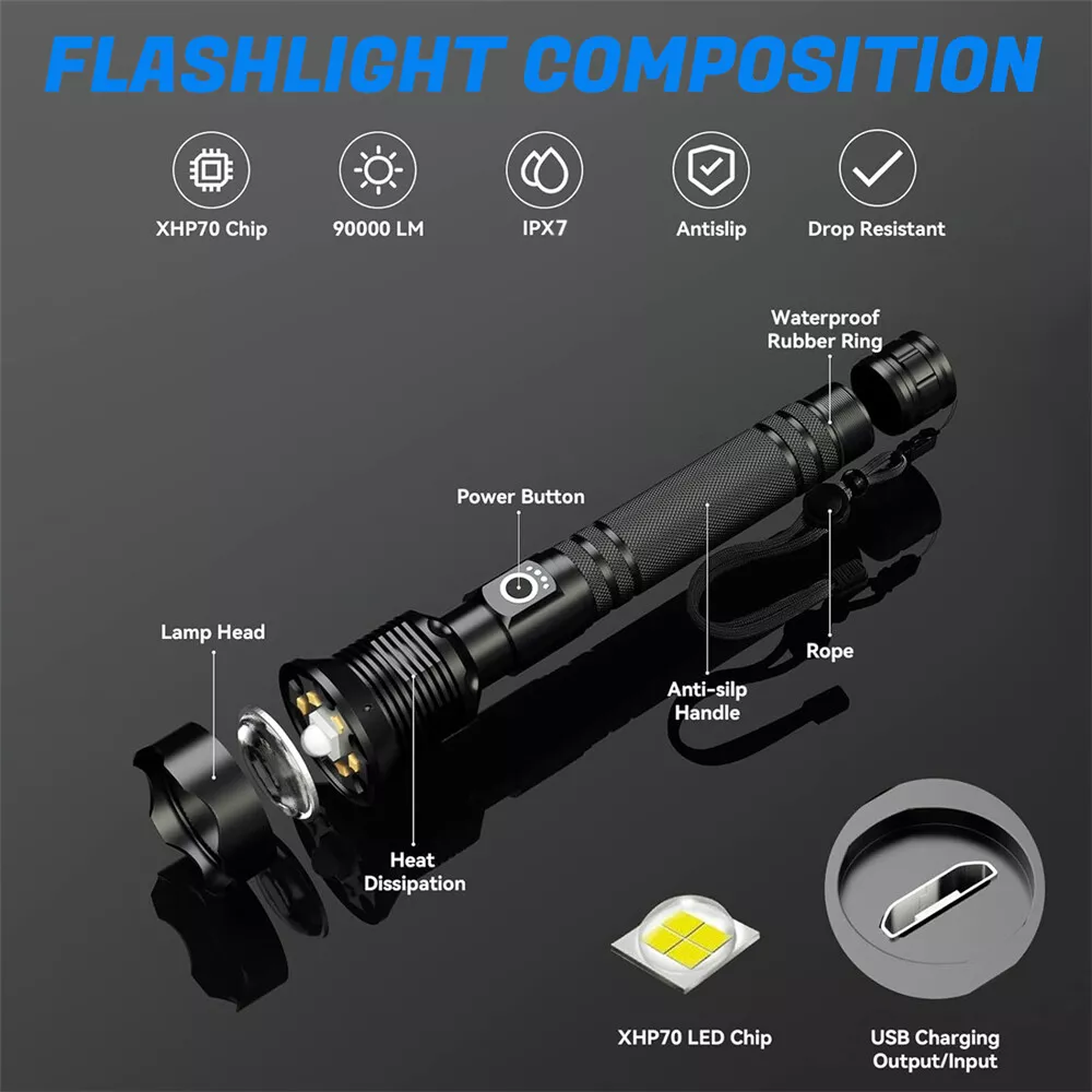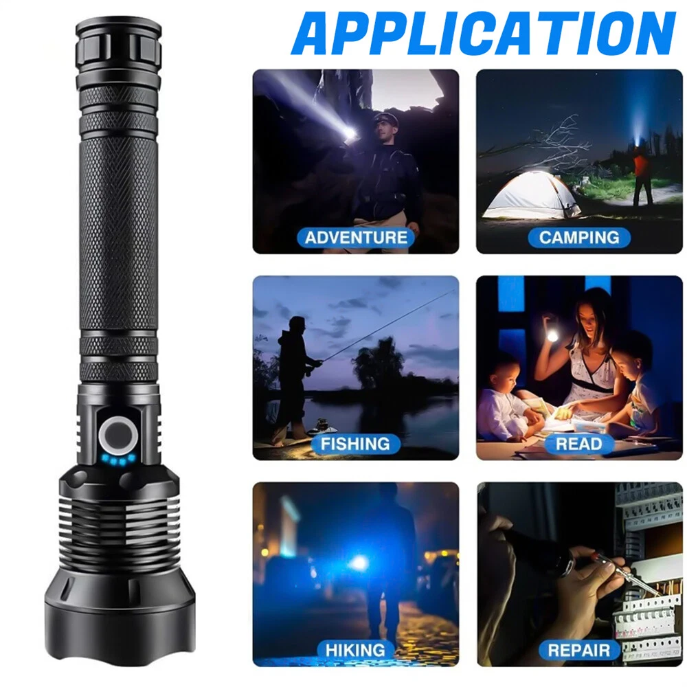 【Better & Brighter】 Hold the long and wide flashlights body in your hand and experience the comfort of holding it. Brightest flashlight can generates an ultra-high output up to 9,000,000 lumens, sweeps bright light over the length of about two football fields and reaches nearly 1093 yard/3280 feet. 【5 Modes】 High lumen flashlight with 5 modes: low brightness,medium brightness,high brightness,strode brightness and sos function, you can switch at will, adapt to different environments of lighting. 【Rechargeable Flashlight & Power Display】 Conveniently powered for rechargeable Βattery. Built in Mrico input port, allows you charging the flashlight conveniently. In addition, rechargeable flashlight have a power display function, so that you can see the power at a glance. 【IP65 Waterproof Material】 Non-slip and IP65 waterproof led flashlight are suitable for outdoor environment and adverse weather conditions. Made of aluminum alloy, protect your heavy duty flashlights from scratched, corrosion, rust, and break. 【Worry-Free After-Sales Sevices】 Try it and you will love it. If you are not satisfied with our product, please feel free to contact our excellent customer support team. Package Contains: 1 x Flashlight 2 x 26650 Battery 1 x USB Cable