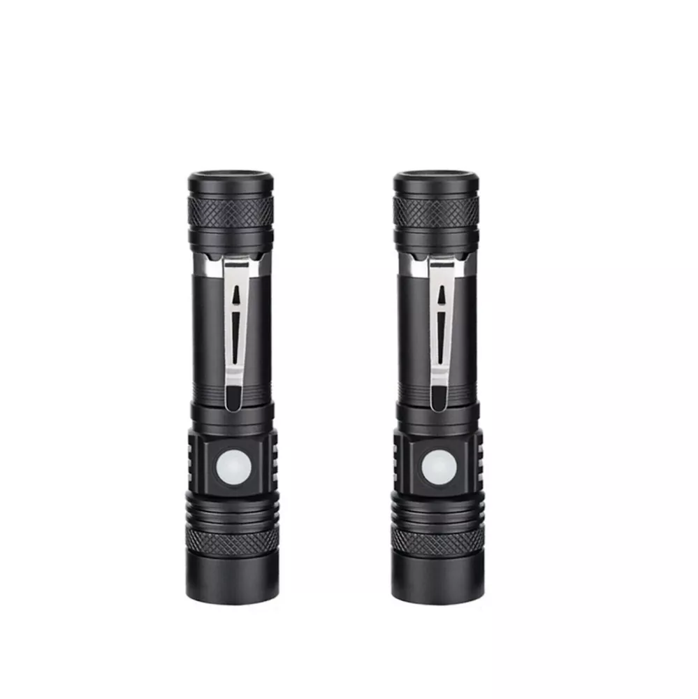 Flashlight Material: Aluminum Color: Black Modes: High/Low/Strobe Size: As Picture Show Package Include: 1X Flashlight or 2X Flashlight 1X USB Cable or 2X cables 1X Rechargeable Battery or 2X Rechargeable Battery Features: 1. Super Bright LED flashlight: Installed with bright T8 light bulb, can reach 200 - 300 meter. 2. USB Charging: Come with usb cable, easy to be charged by any usb interface like power bank, car charger. 3. Adjustable Focus: 3 modes ( High/Low/Strobe) and wide-to- narrow beam zoom makes this flashlight ideal for use around the house, dog walking, or camping. 4. Small and Lightweight: Compact enough to fit in your pocket, backpack, or purse allowing for easy storage and quick access. 5. IP65 Waterproof: Perfectly used in the rain, snow or emergency situations. 6. Pocket clip design :The pocket clip helps to keep the flashlight from rolling away when it & apos;s placed on a flat surface and can be tied to belt, makes this small flashlight perfectly as your EDC flashlight.