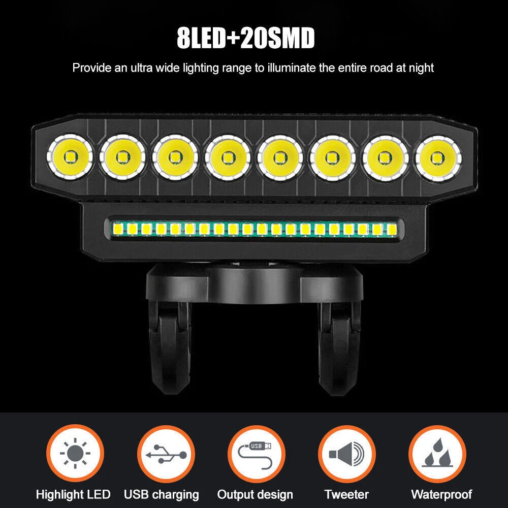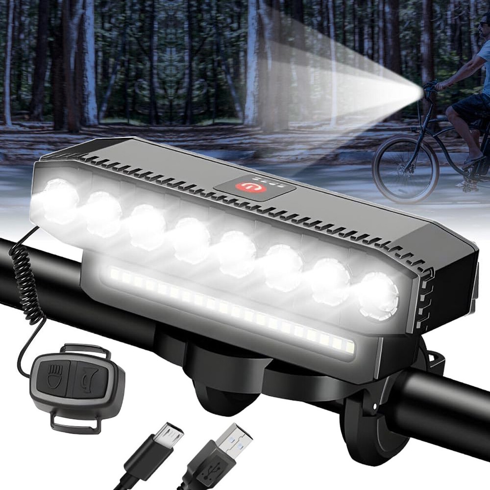 Features: 【Super Bright】 【Charging Input and Output】 【Multiple Modes】 【Waterproof and Durable】 【Power Display】 Specification: Beads: 8LED+20SMD Material: ABS Modes: 6 modes (8LED+20SMD full bright-8LED strong light-8LED weak light-8LED breathing light-20SMD strong light-8LED+20SMD burst flash) Charging mode: USB charging Battery capacity: 4000 mAh Waterproof: IP44 Speaker: 130db Product size: 138*40*51mm Package Included: 1 x Bicycle light 1 x Horn Bicycle Front Headlight Super Bright LED Bike Light USB Rechargeable Waterproof Features: 【Super Bright】Bike lights is very bright with the maximum output is 9500 lumens, the 8 led and 20 smd lights cover a wide range up to 800m,bike headlight allows you to ride at night to see wider and further areas, also makes your night riding safer. 【Charging Input and Output】In addition to the normal usb input rechargeable function,this bike headlight also has a USB output function.Bike light has a power bank function that can charge your phone.This is a very important when you are riding outdoors. 【Multiple Modes】6 lighting modes, which can adapt to different scenes. Besides being used as a bicycle light, you can also use it for camping, fishing, night work and activities,bike lights for night riding has a high decibel speaker, and equipped with a wired button switch, making your operation more convenient and safe 【Waterproof and Durable】Bike headlight made from high-quality materials, the bike lights are designed to withstand bike、bicycle、 riding、mountain cycling accessories,bike headlight with IP44 waterproof ratings, bicycle lights front and rear can handle rain, snow, and other outdoor elements. 【Power Display】The rechargeable high powered led bike lights for night riding comes with battery level display,bicycle light shows the battery level and charging status,allowing you to monitor the power status at all times. Specification: Beads: 8LED+20SMD Material: ABS Modes: 6 modes (8LED+20SMD full bright-8LED strong light-8LED weak light-8LED breathing light-20SMD strong light-8LED+20SMD burst flash) Charging mode: USB charging Battery capacity: 4000 mAh Waterproof: IP44 Speaker: 130db Product size: 138*40*51mm Package Included: 1 x Bicycle light 1 x Horn Payment Shipping Return Contact us About us Payment 1.Paypal, Credit Card, G Pay etc, many payment way is accepted. 2.Please be sure your shipping address is correct before make a payment. Shipping 1.We will ship out the item within 1-3 business days after comfirming the payment, appreciate your patience. 2.If the items are broken on the way( we will check the orders clearly before we sent them ),please contact us in 3 days you received it. We will send you a new one or refund your payment. Return 1.We stand behind every buyer.Items can be returned for exchange or refund within 30 days. 2.Please contact us when you have any confusion of our item, we will solve the trouble for you as soon as possible. Contact us 1.This is professional Seller.We will reply your message within 24 hours. 2.Please contact us whenever you have any question about the item. We will deal with it as soon as possible. 3. If you are unhappy with the item or our service,please Contact Us before leave feedback,just give me a chance,thank you! About us 1. Unless specified otherwise, all our products are IN STOCK and are shipped from Local warehouse - Not Overseas! 2. We provide a 30 day Satisfaction Guarantee or your money back (provided items are in the same new and resaleable condition.) 3. We have a PayPal Verified Business Account, please buy with Confidence! 4. Every item will be tesrted before send.We know our products well and if we don't have the answers we will do our best to find them for you! 5. Our friendly team look forward to serving you! Your satisfaction is our No.1 Priority We will do our best to satisfacy you.