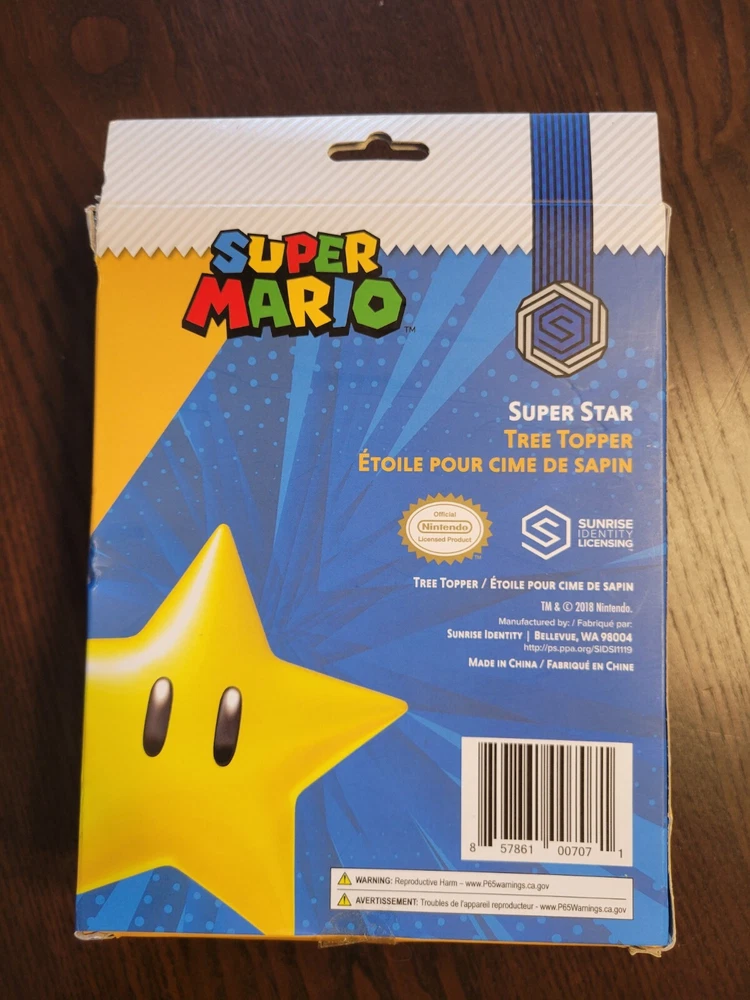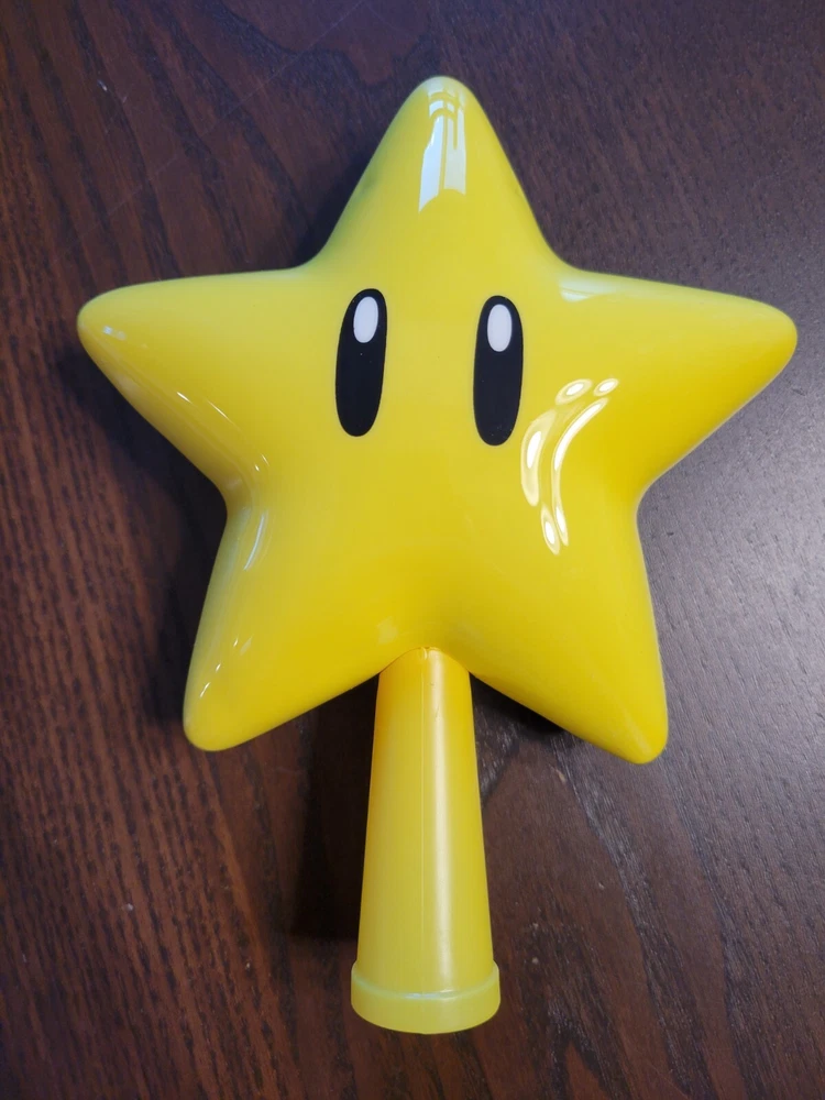 Star is in the original box but has been opened and possibly used. The Star is in great condition, but the box does have some damage. Add a touch of fun to your Christmas tree with this Super Mario Super Star Tree Topper. The yellow star-shaped topper features the beloved Star from the Mario franchise. It is made of durable plastic and comes with a box for easy storage. This tree topper is perfect for any fan of the Super Mario Bros. franchise who wants to add a unique touch to their holiday decor. It is suitable for Christmas trees and is sure to catch the eye of anyone who sees it. Get your hands on this 2018 release and show off your love for Mario this holiday season.