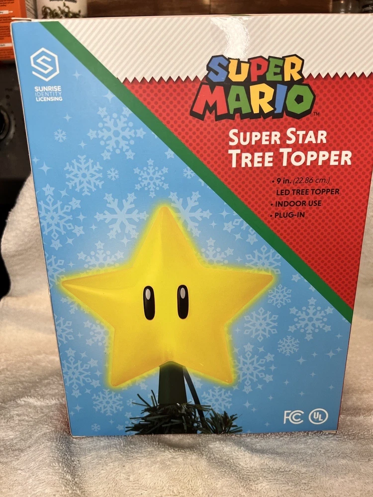 Add a touch of Super Mario magic to your Christmas tree with this collectible Super Star Tree Topper. The star-shaped topper features the iconic Mario character and is perfect for fans of the Super Mario Bros. franchise. The set includes the star tree topper, ready to complete your holiday decorations. This Nintendo-branded Star Tree Topper is a must-have for any Mario lover, and it's sure to bring a smile to everyone's face this holiday season. The tree topper is designed to fit any tree and will make a great addition to your collection of Super Mario Bros. memorabilia. Get ready to make your Christmas tree shine with this amazing Super Star Tree Topper!