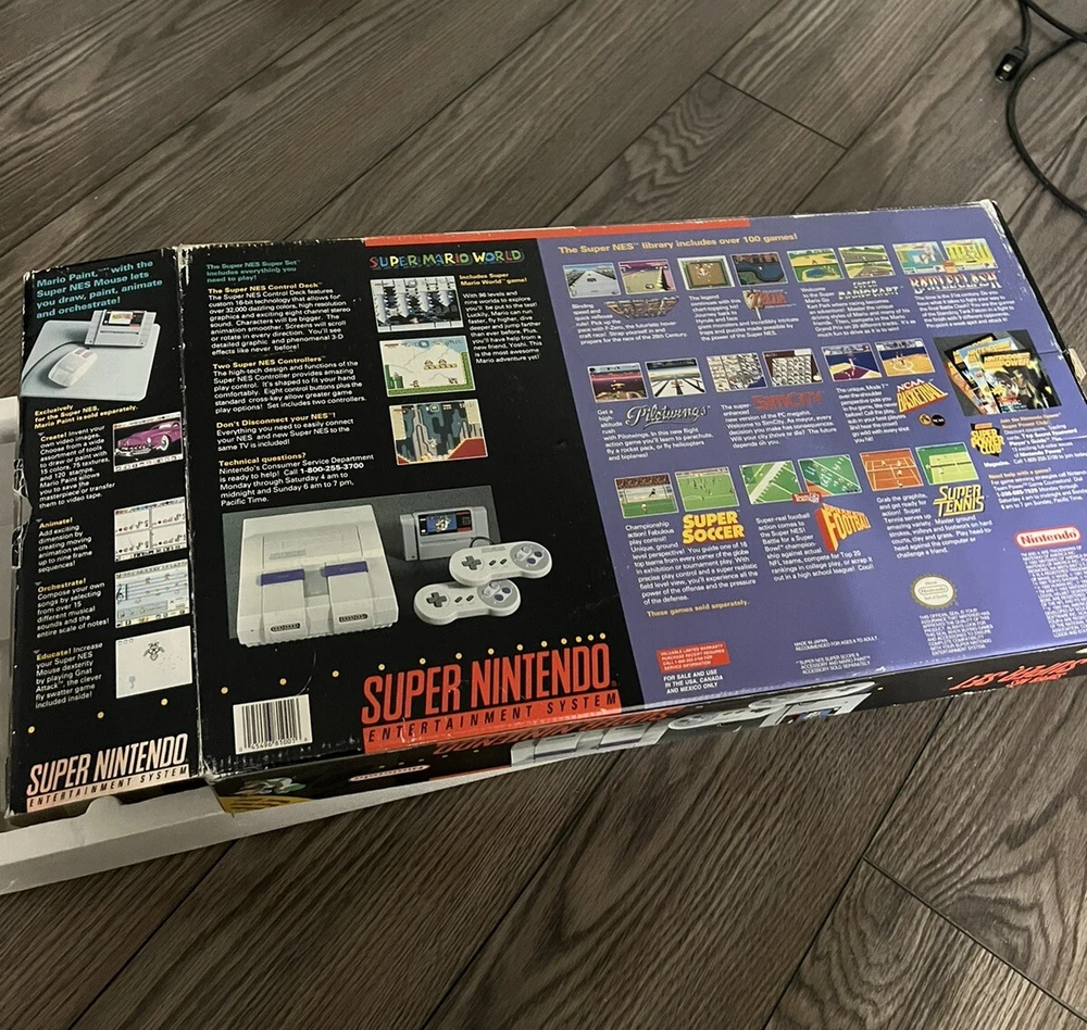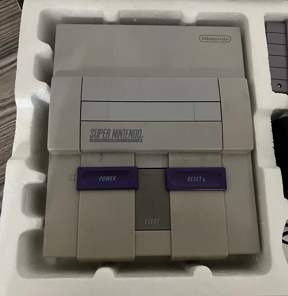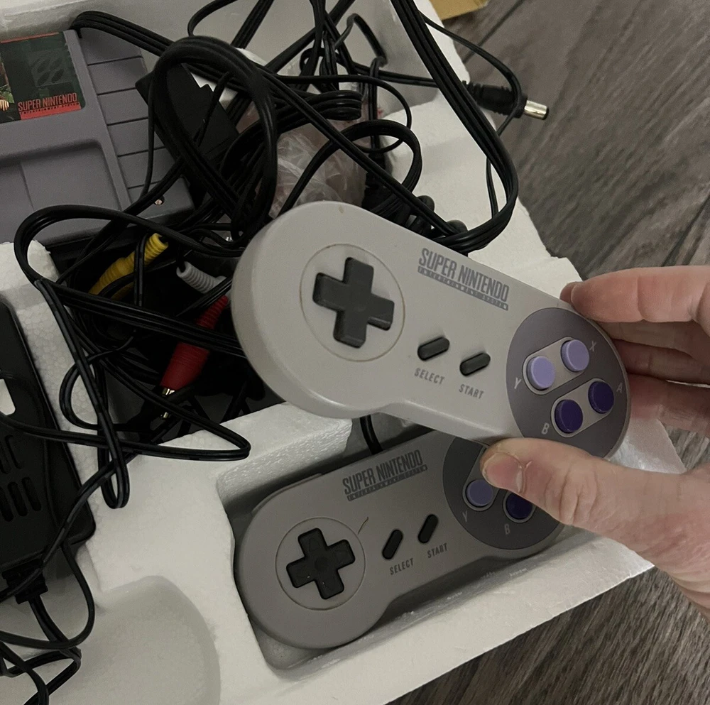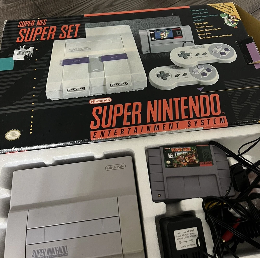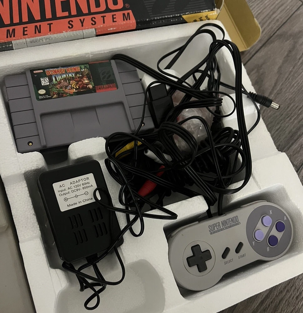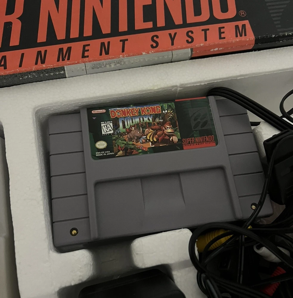 Includes console, 2 controllers, power cords, donkey Kong country cartridge, original box. Good condition, works well. Feel free to ask for more pics!