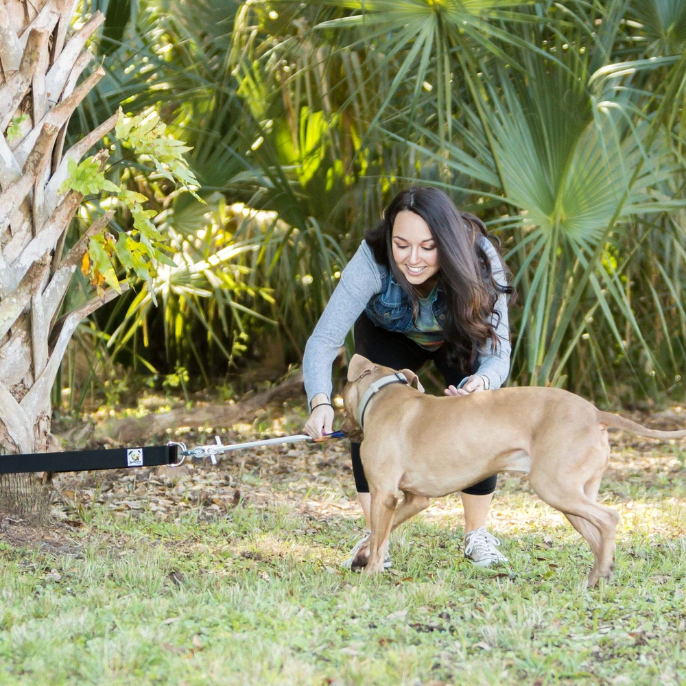 For The Strong Dog Owner - Finally, A Safe, Easy, And Painless Way To Play Tug-Of-War. Tug-of-war is a game that dogs naturally love to play and can be great exercise. If you have a powerful dog like I do, you know what happens to your arm and shoulder after a few minutes of playing. Ouch! Looking for a solution to this problem, I read about something called a "spring pole". A spring pole involves using a large metal spring to suspend a rope from an overhead tree branch with a toy hanging from the end. Then the dog can hang, shake and tug against the resistance of the spring. I made for our high energy pit bull dogs and they loved it. Unfortunately, I quickly found some serious design flaws that ended up causing an injury (thankfully minor) to Maxwell, our company mascot. So I designed the Super Tug, a safer alternative to the spring pole. It uses a horizontal configuration instead of the vertical used in traditional spring pole designs. It also uses super strong, bungee cord instead of a metal spring. The connection points are designed so that in case of failure, nothing comes flying back towards your dog. The Super Tug is made in the USA using components tested for durability, strength and safety. Be sure to watch the video to see the Super Tug in action. With our Year No Risk , you can return it for any reason within year of purchasing for a full , including shipping costs (if applicable). What are you waiting for. Order yours now! Designed to hold up to the most powerful dogs but will still work with dogs of any size Strap is long enough to wrap around trees up to approximately 94" in circumference 2-inch wide heavy-duty webbing strap has the strength of chain without causing damage to tree bark Also works great as a training tool and provides the exercise dogs need Included polyester webbing Tug Toy is durable yet soft on your dog's mouth Included components: Super Tug strap, bungee, quick link, Tug Toy