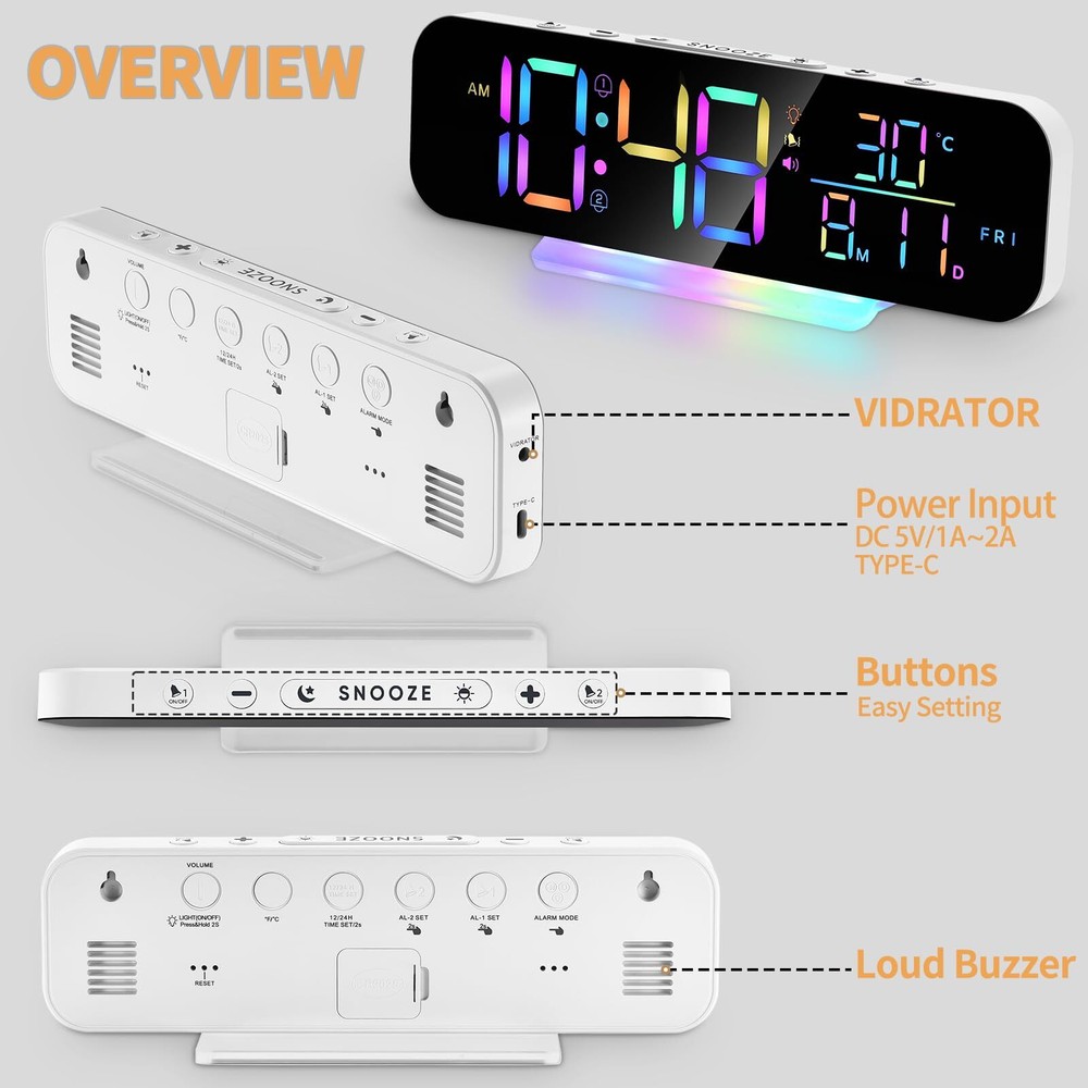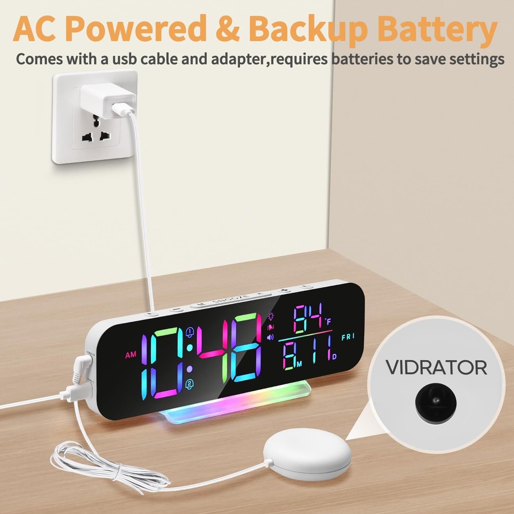 Despertador súper ruidoso con vibrador para dormir,quienes duermen profundamente Features: ① Modos de alarma mejorados para un despertar seguro. Elija entre 4 modos de alarma mejorados: un timbre fuerte, un potente vibrador de cama, una luz roja intermitente o una combinación de los tres, para ayudar a las personas con sueño pesado, con dificultades auditivas y sordas a despertarse a tiempo. Simplemente presione el botón MODO DE ALARMA para configurar su método de despertador favorito. ②Potente vibrador para un despertar tranquilo. El cable vibrador extra largo de 180 cm permite colocar el vibrador debajo de almohadas o colchones para crear potentes vibraciones sin molestar a los demás. Con 4 niveles de sonido ajustables, combina el volumen más alto con el vibrador para un despertador fiable. ③Alarmas duales para diferentes horarios. Las alarmas duales permiten a parejas o compañeros de piso con diferentes horarios configurar dos horas de despertador independientes. Disfruta de 9 minutos extra de sueño pulsando el botón de repetición antes de que vuelva a sonar la alarma. ④Pantalla extragrande con brillo ajustable. La pantalla LED de 19 cm cuenta con dígitos extragrandes fáciles de leer a distancia, incluso sin gafas. Ajusta el brillo de la pantalla en 5 pasos: tenue para un sueño reparador o brillante para una mejor visualización durante el día. ⑤Alimentación por adaptador de CA con batería de reserva. El despertador requiere alimentación por adaptador de CA, pero incluye una batería de reserva para mantener la configuración durante cortes de luz. El práctico puerto de carga USB (5 V/1 A) permite cargar dispositivos durante la noche. ⑥ Interfaz intuitiva: Con su interfaz intuitiva, este despertador multifuncional es un regalo ideal para todas las edades. Ofrecemos una garantía de devolución gratuita de 18 meses y 30 días. ¡Contáctanos si tienes alguna pregunta! SHIPPING We are always working hard to ensure your package arrives as soon as possible. Please understand that some factors like weather, high postal traffic, and the performance of shipping companies are outside of our control. We offer free shipping to the lower 48 states and ship within 3 business days of payment, usually sooner. We do not accept P.O. Boxes. Please provide a physical address.