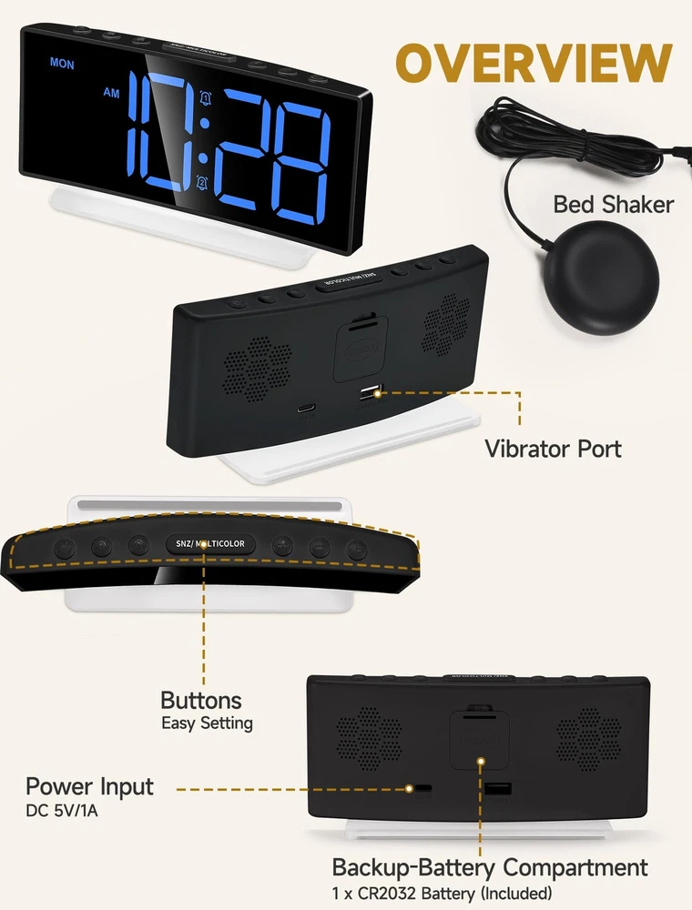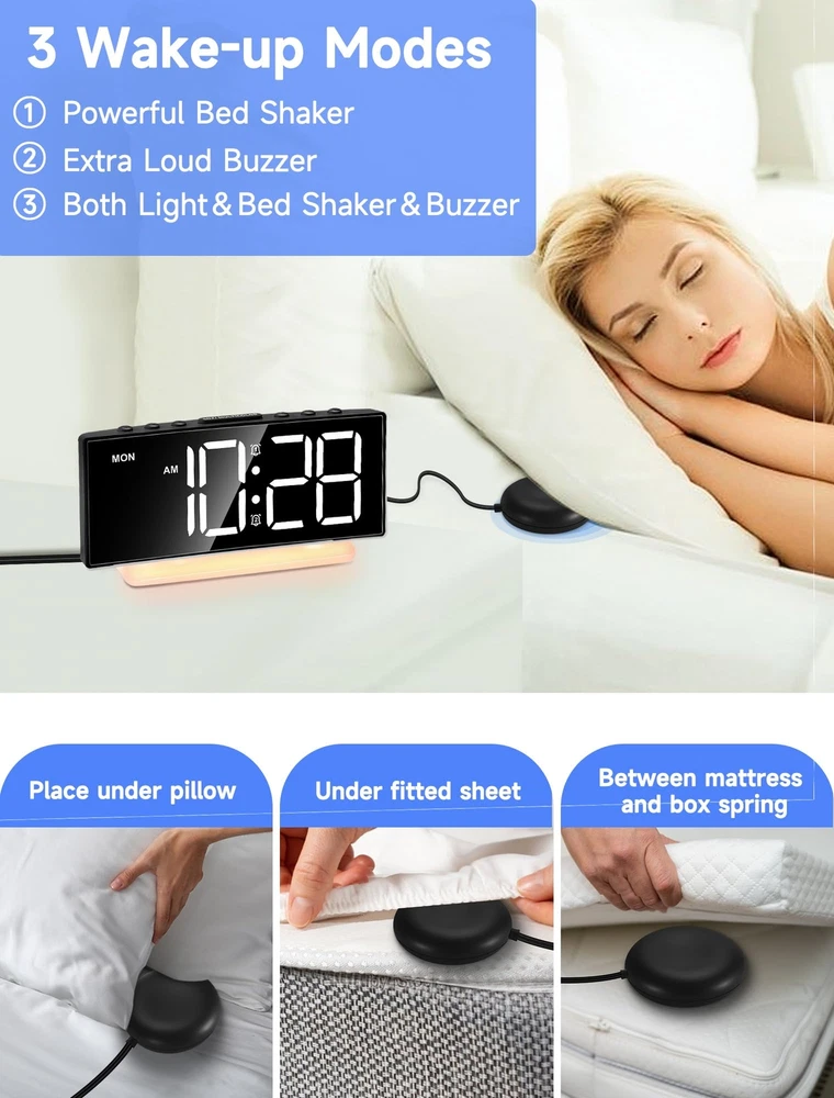 Despertador súper ruidoso con vibrador para dormir,quienes duermen profundamente Features: 3 modos de activación: elija entre nuestro timbre extra fuerte de 95 dB, súper vibrador o combine ambos para una poderosa experiencia de activación. Perfecto para personas con sueño profundo, personas con discapacidad auditiva y personas sordas. Potente vibrador con cable y volumen ajustable: El reloj incluye un vibrador con cable de 198 cm que se puede colocar debajo del colchón para despertarte sin molestar a los demás. Con un volumen máximo de 105 dB y 4 niveles ajustables, es ideal para despertar eficazmente a niños, adolescentes y estudiantes. Pantalla RGB dinámica y luz nocturna: Disfruta de 8 pantallas de colores diferentes y una luz ambiental arcoíris de 7 colores con este adorable reloj, perfecto para niños y niñas, que añade un toque moderno y divertido a cualquier decoración de escritorio. Características básicas: Este despertador eléctrico cuenta con alarmas duales, función de repetición de 10 minutos y puerto USB para cargar el teléfono. También ofrece formato de 12/24 horas y modo entre semana/fin de semana. Alimentación por enchufe y batería de respaldo: Este reloj compacto se alimenta mediante el adaptador de corriente USB incluido, lo que ofrece la comodidad de un diseño enchufable. También incluye batería de respaldo, por lo que no necesitarás... Para restablecer la hora y la alarma tras un corte de luz. Fácil de usar: El despertador está diseñado para un uso sencillo con botones de configuración intuitivos, lo que lo hace adecuado para personas de todas las edades, incluyendo niños y personas mayores. Cuenta con funciones actualizadas como vibración, alarma dual, regulador de intensidad, puerto de carga USB y un diseño moderno, lo que lo convierte en la opción perfecta para familiares, amigos e hijos. SHIPPING We are always working hard to ensure your package arrives as soon as possible. Please understand that some factors like weather, high postal traffic, and the performance of shipping companies are outside of our control. We offer free shipping to the lower 48 states and ship within 3 business days of payment, usually sooner. We do not accept P.O. Boxes. Please provide a physical address.