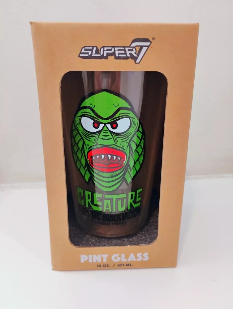 Super7 Universal Monsters Freaky Faces Creature From The Black Lagoon Pint Glass Inspired by 60s hot rod culture, Super7’s Universal Monsters “FreakyFaces” drinkware collection includes this 16 ounce, 5.75” tall pint glass featuring The Creature from the Black Lagoon! Each glass comes individually boxed. Perfect for use in your kitchen, home bar, dungeon laboratory, or haunted mansion.