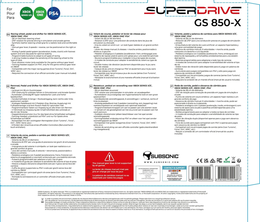 Manual gearshifter with clutch pedal. Dual vibration motor only in sequential mode via paddle shifters (does not work with the gear lever connected). Compatible with gaming helmets. Crankset with accelerator and brake pedals. Gear shift paddles. Fully replaces the joystick: navigation in the menus via the directional cross and buttons on the steering wheel. Rotation angle 270°. Sensitivity adjustment (3 sensitivity levels). Wide crankset with footrest system and anti-slip pads for optimum stability. Dual-axis tilt pedals: improves comfort. Suction cup or clamp fastening system. Reprogrammable buttons to adapt to all types of play. Compatible with the main simulation seats on the market (Superdrive, SRC, playseats...) Connects directly to the controller. 100% compatible with all racing games (Gran Turismo Sport, Forza Horizon 5, Forza Motor Sport 7, Project Cars 2, Need for Speed, Dirt, WRC, Grid, V Rally 4, Gear Club 2... and even GTA V etc. Compatible with Xbox Serie X / S, PS4, Xbox One. Manual gear lever (6 speeds + reverse). +/- speed change paddles. Large crankset with footrest system and accelerator, brake and clutch pedals. Microphone gamer headset compatible. Angle of rotation 270 °. Sensitivity adjustment (3 sensitivity levels). Suction cup or clamp fixing system for simulation seats. Fully programmable, compatible with all racing games (Gran Turismo Sport, Forza Motor Sport 7, Forza Horizon, Project Cars 2, Need for Speed, Dirt, WRC, Grid, V Rally 4, Gear Club 2, GTA V ...)
