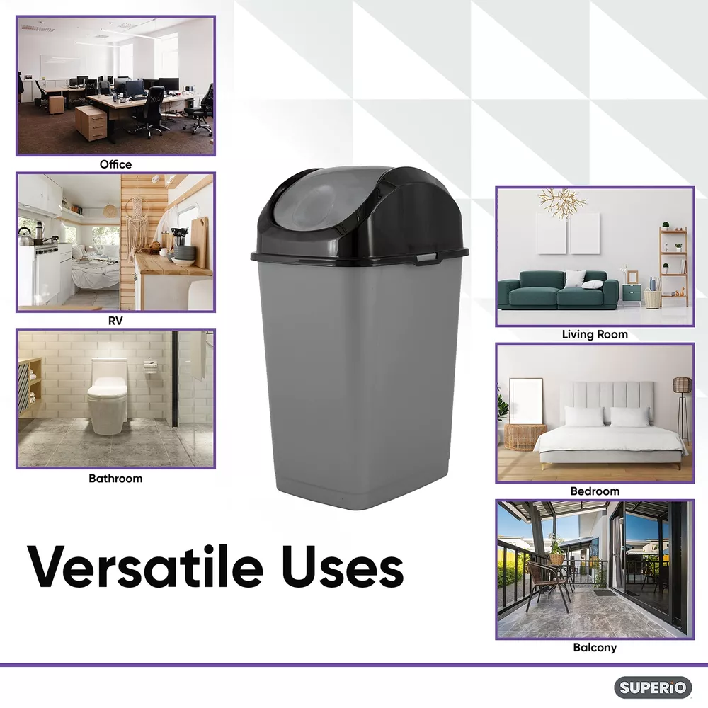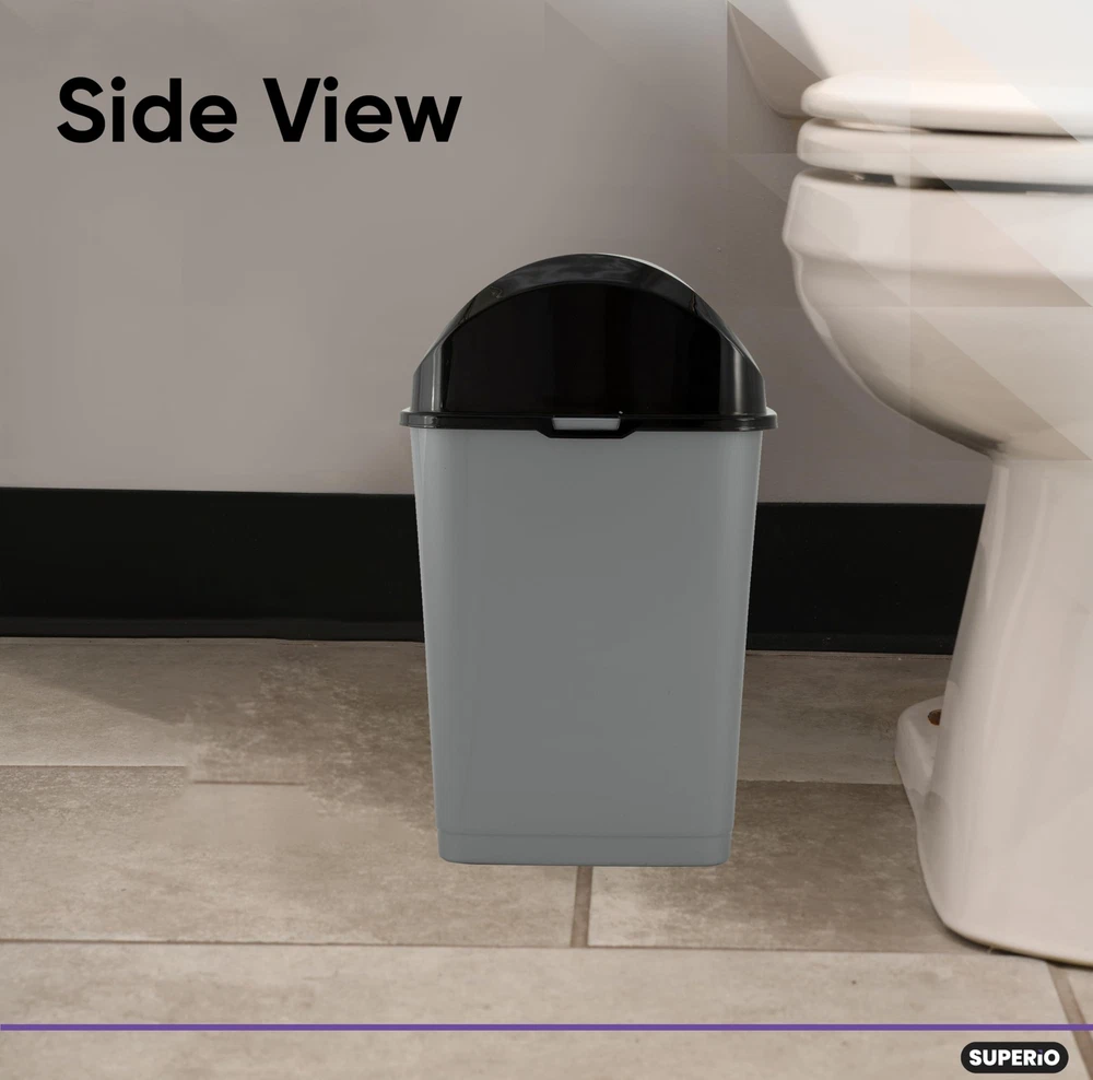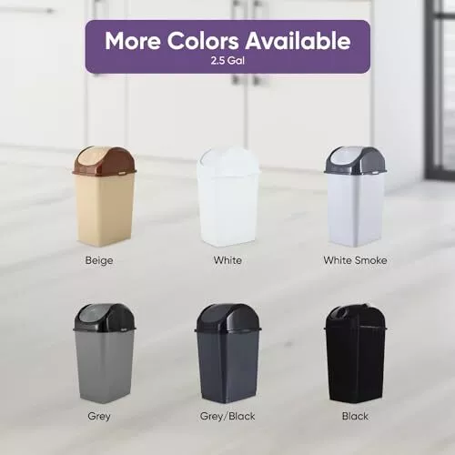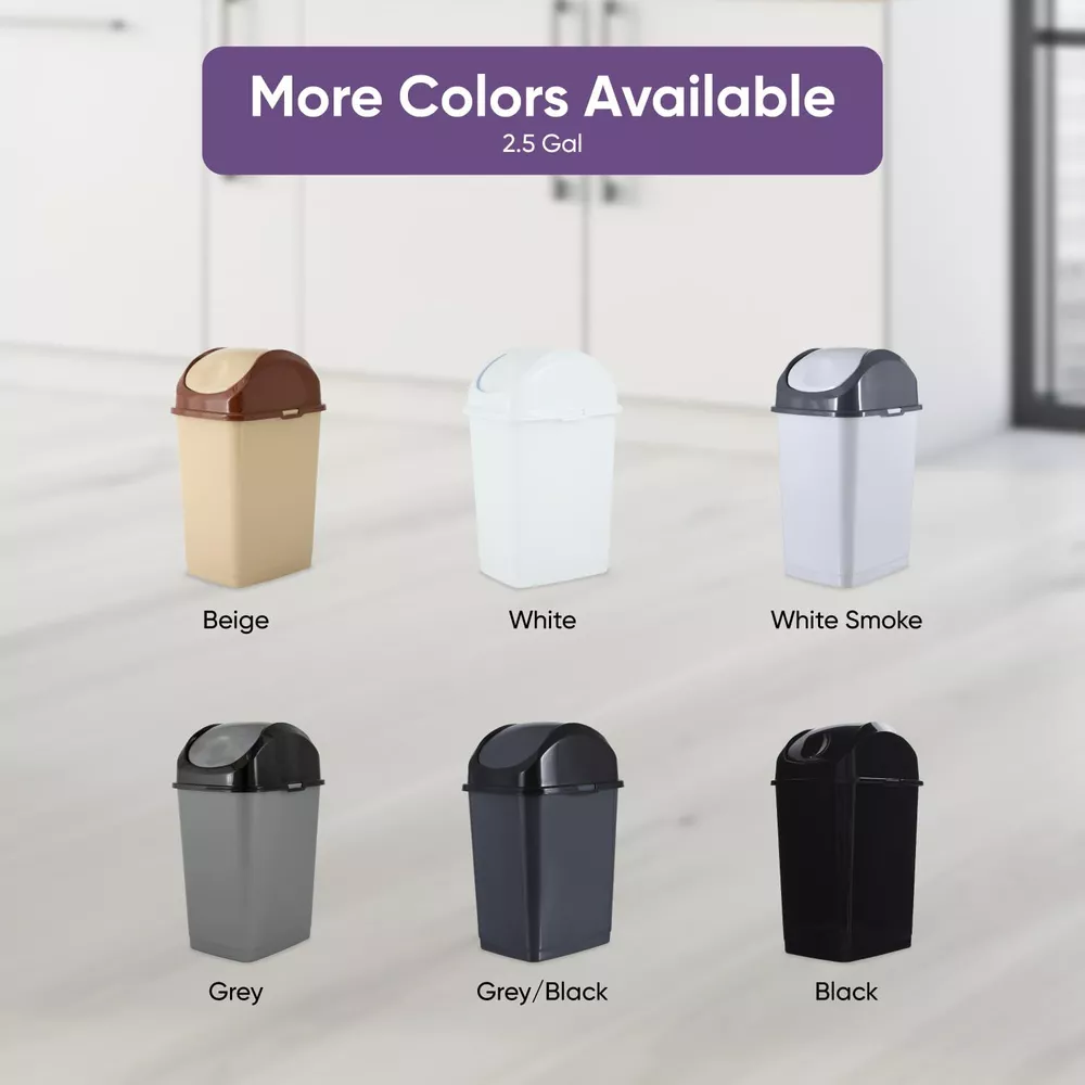 Swing Top Lid- You don't have to work hard and open the cover of your trash can just use this easy swing lid which is practical and closes right away thus keeping all the trash out of sight. Zero Chance of Rust - Unlike stainless steel trash cans, this durable and high-quality plastic garbage can, will never rust! Comes in 6 Colors - We have a color to suit every preference! No matter the decor style, one of these trash can color, will work in your space. Simple and Easy to Clean - Trash cans can get dirty quickly, which is why we offer a trash can that allows you to get into nooks and crannies without breaking a sweat! Dimensions- This can is 2.5 gallons and 14.5 x 7 x 9 inches and fits into tight spaces.