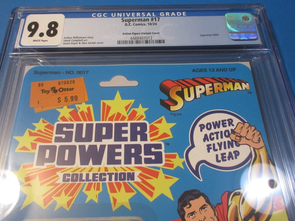 This auction is for Superman #17 variant in CGC 9.8 with a brand new case condition. This week we are selling a great collection with Captain America, Spawn, Spider-man, Eternals,Fantastic Four, Iron Man, Hulk, Batman,Avengers, X-men and many CGC books and many other 1st appearance key issues. You are sure to find something you are looking for this week. Bonus Offer! Win 2 or more auctions and earn an extra bonus comic plus an additional upgraded bonus when you win 10 auctions . Our Shipping rates are: USA: Free for single comics with no limit, multiple comic lots have a charge and additional combined lots are half price. Canada: 13 Dollars for the 1st comic and 1.50 each after that. International: 15 dollars for the 1st comic and 1.50 each after that. CGC books are 9.99 for the 1st and 5 each after that in the USA, 18 bucks and 9 combined for Canada and 27 bucks and 13.50 combined for international. Feel free to ask questions. I guarantee superfast Domestic shipping! ...to open their eyes...that they may receive forgiveness of sins and a place among those who are sanctified by faith in me. Acts 26:18