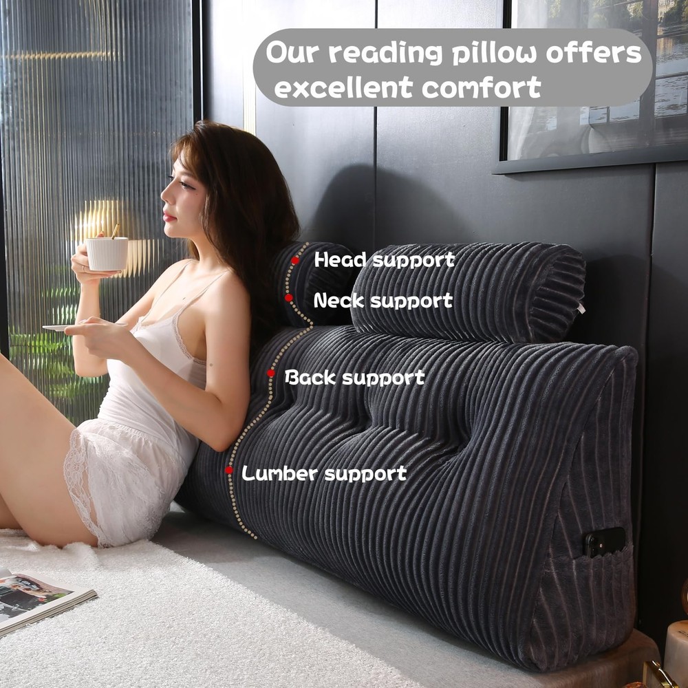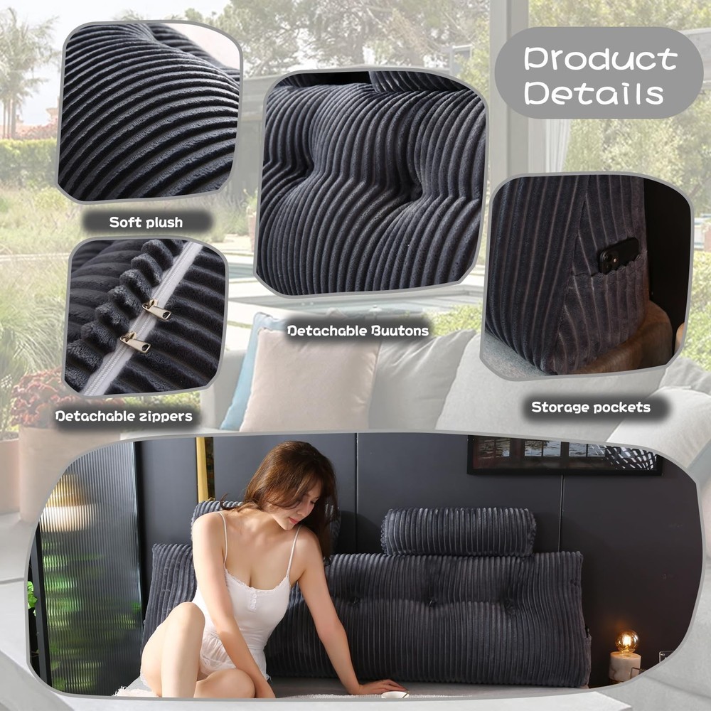 Headboard Wedge Pillow Cozy and Ergonomic Bed Rest Pillow. Crafted with premium eco-friendly soft Linen fabric and filled with a blend of high-quality polyester fiber, this bed rest pillow offers unparalleled comfort and support. It's an ideal choice for those who wish to lounge in bed without discomfort, ensuring exceptional support for your back, lumbar region, and neck. Large Headboard Wedge Pillow with Two Neck Roll Pillows. This set includes two detachable round pillows, perfect for additional back or head support, allowing you to place them wherever you need for optimal comfort. The wedge pillow also features two side pockets, providing convenient storage for your phone, glasses, or other small items, making it easy to locate your essentials in the middle of the night. Ultimate Comfort Pillow. This triangular bolster pillow is perfect for leisurely days in bed, offering the right mix of support, comfort, and durability. Whether you use it to prop up your back or elevate your legs, it enhances the experience of late-night TV watching and reading. An ideal pillow for those who spend extended periods in bed, it ensures a cozy and supportive resting experience. Versatile Use. Incredibly soft and cozy. This triangle wedge pillow offers outstanding back support and perfectly fills the gap between your mattress and headboard or wall, preventing pillows from slipping into the void. It also adds a layer of cushioning against hard surfaces. Ideal for dorm rooms, beds, daybeds, sofas, couches, floors, or kids' playrooms. Stylish and Comfortable. Easy to maintain, this pillow features a removable cover with convenient zipper closures, making it simple to take off and machine wash. This ensures your pillow remains fresh and clean. Its sleek and elegant design seamlessly integrates into various spaces in your home, adding a touch of style and comfort.