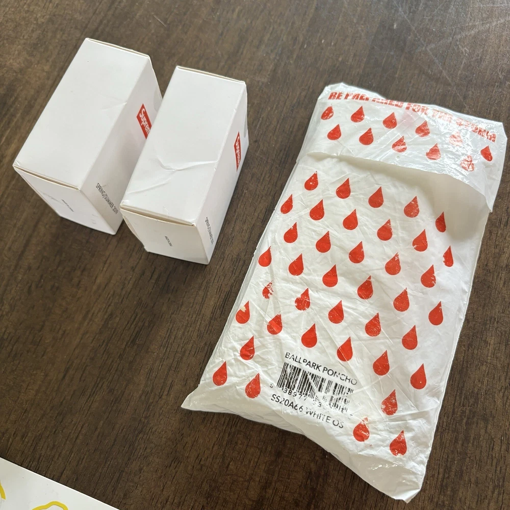 Everything is new in box, take note of photos for any minor cosmetic damage/wear from storage. This Supreme Accessories Bundle Set includes a Poncho, Shower Cap, Bubbles, and Stickers Lot. The items are all brand new and have never been used. Each item is from the popular brand Supreme, known for their high-quality and stylish accessories. The bundle set is perfect for anyone looking to add some Supreme pieces to their collection, or for those who want to make a statement with their accessories. The set includes a variety of items, making it a great value for the price.