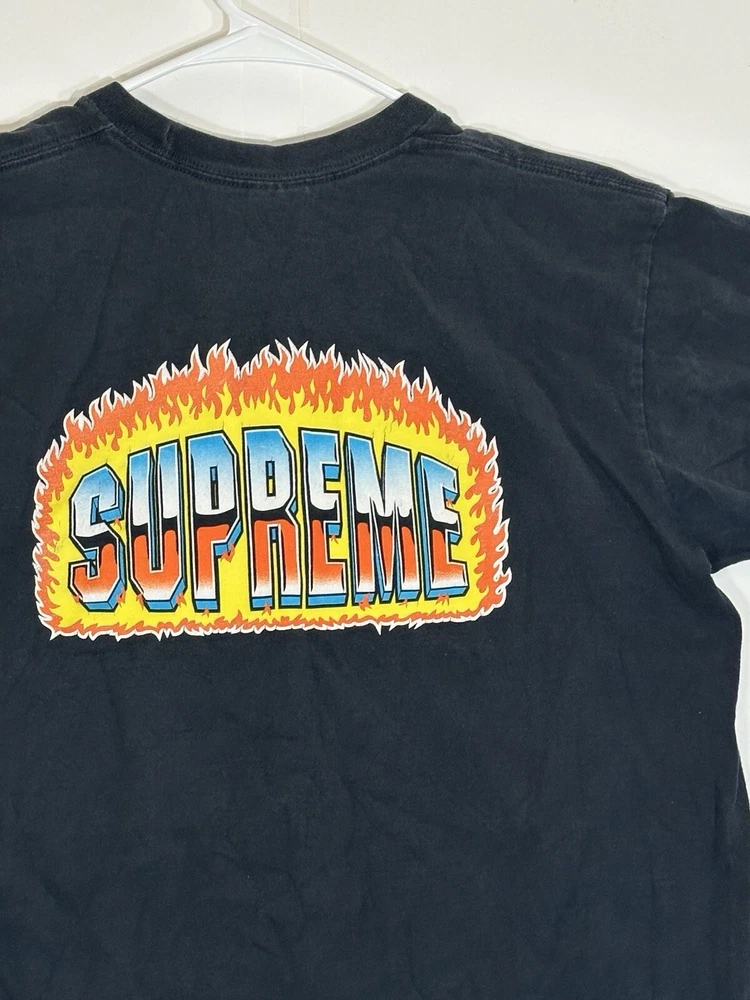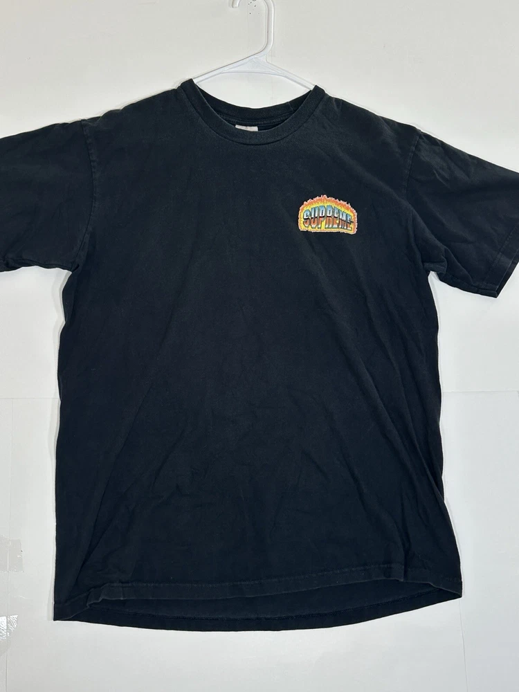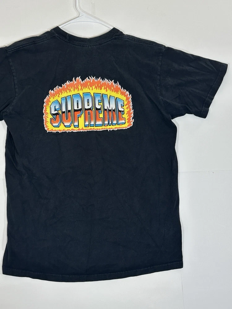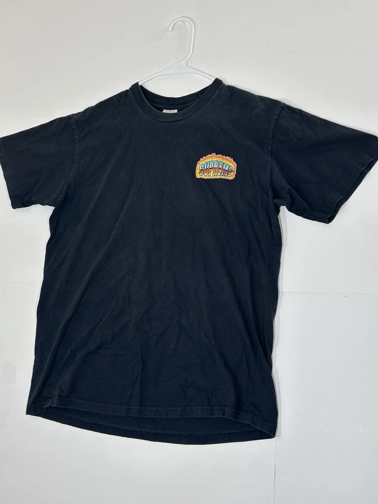 Supreme Chrome Fire Solid T-Shirt Black Men's Size Medium Skate Skateboarding USA Decent - to - pretty good condition overall - see ALL photos very closely Shirt has some discoloration/fade - light mild - to - moderate wear/tear overall throughout tee - some light marks throughout if anything - see ALL photos very closely for condition of tee Will ship with care