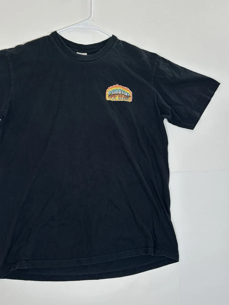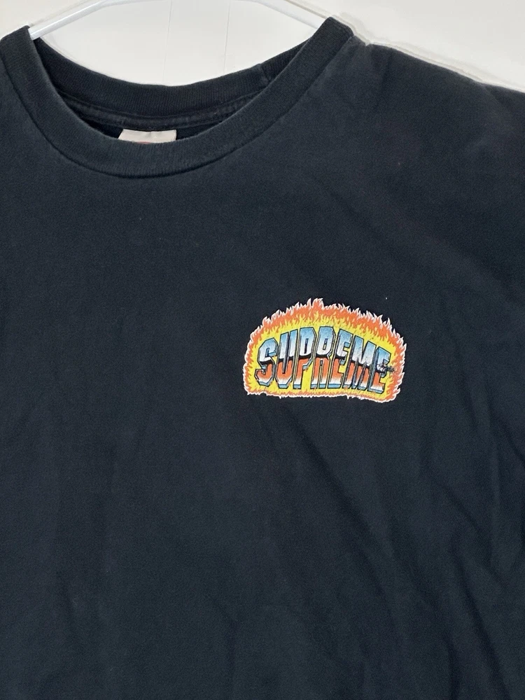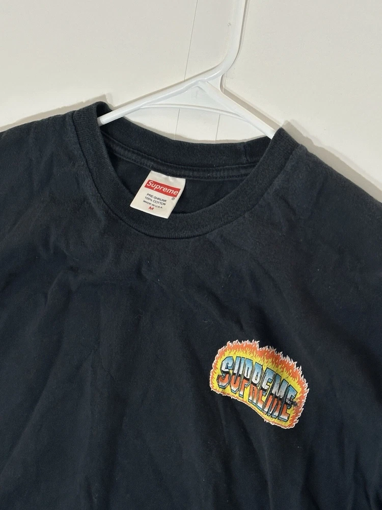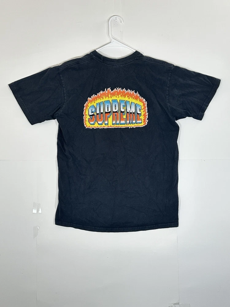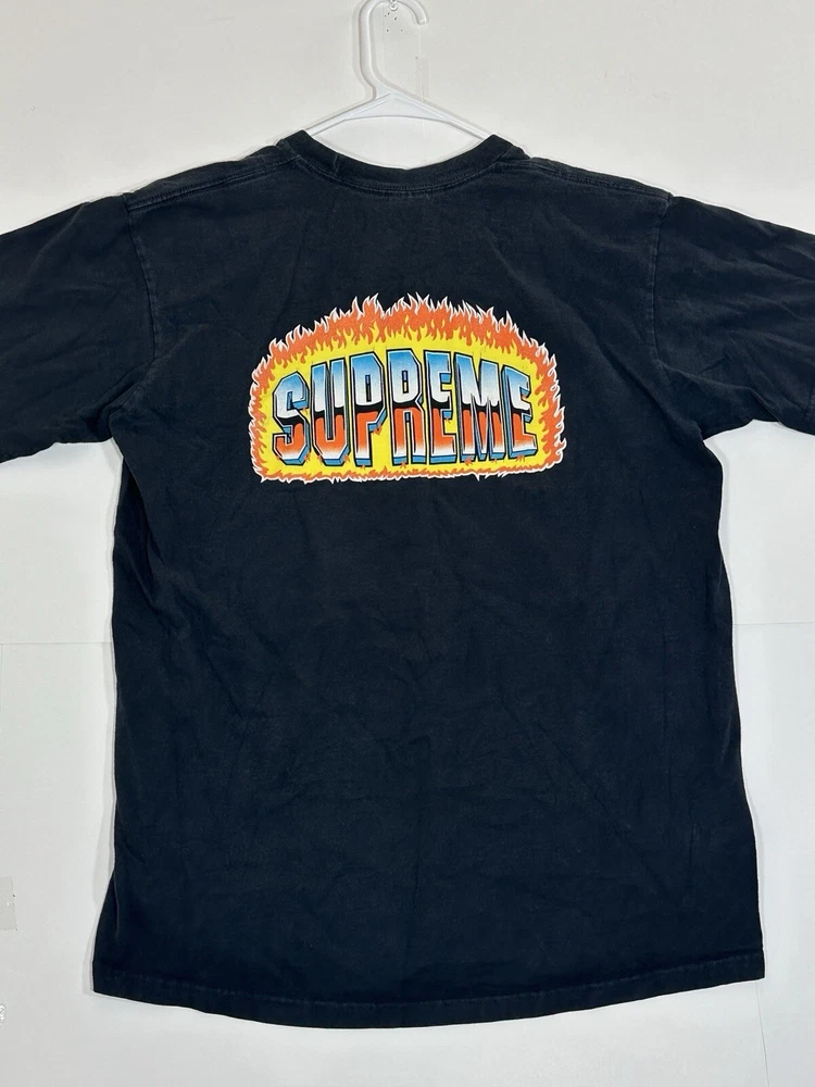 Supreme Chrome Fire Solid T-Shirt Black Men's Size Medium Skate Skateboarding USA Decent - to - pretty good condition overall - see ALL photos very closely Shirt has some discoloration/fade - light mild - to - moderate wear/tear overall throughout tee - some light marks throughout if anything - see ALL photos very closely for condition of tee Will ship with care